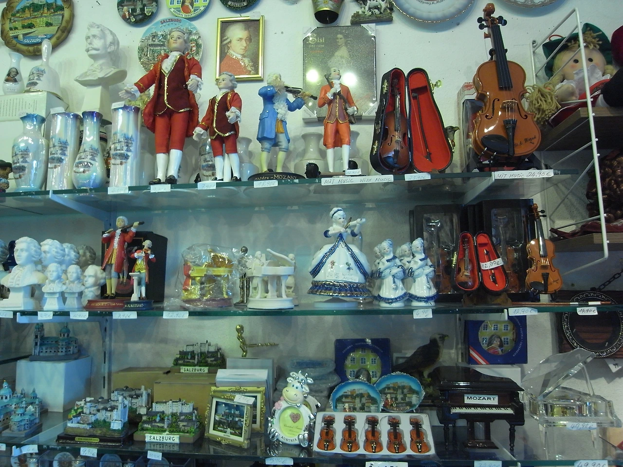 광장에서 오른편으로 시선을 돌리면 잘츠부르크 대성당(Salzburger Dom)이 서 있다. 빈티지 민트 빛깔의 둥근 돔이 인상적인 성당에서 모차르트가 세례를 받았다고 한다. 이처럼 가옥과 광장, 동상, 성당에 이르기까지 작은 도시 곳곳이 모차르트의 흔적과 기억을 품고 있다. 그의 자취는 이것으로 그치지 않는다. 잘츠부르크 상점 중에 그와 관련된 기념품을 팔지 않는 곳을 찾는 게 쉬울 듯하다. 어느 상점 어떤 진열장을 보아도 어떤 형태로든 그가 있다. 모차르트 인형, 모차르트 기념엽서, 모차르트 열쇠고리, 작은 악기 모형 등 그를 상기시키는 다양한 것들이 상점 진열장마다 빼곡히 자리하고 있다.