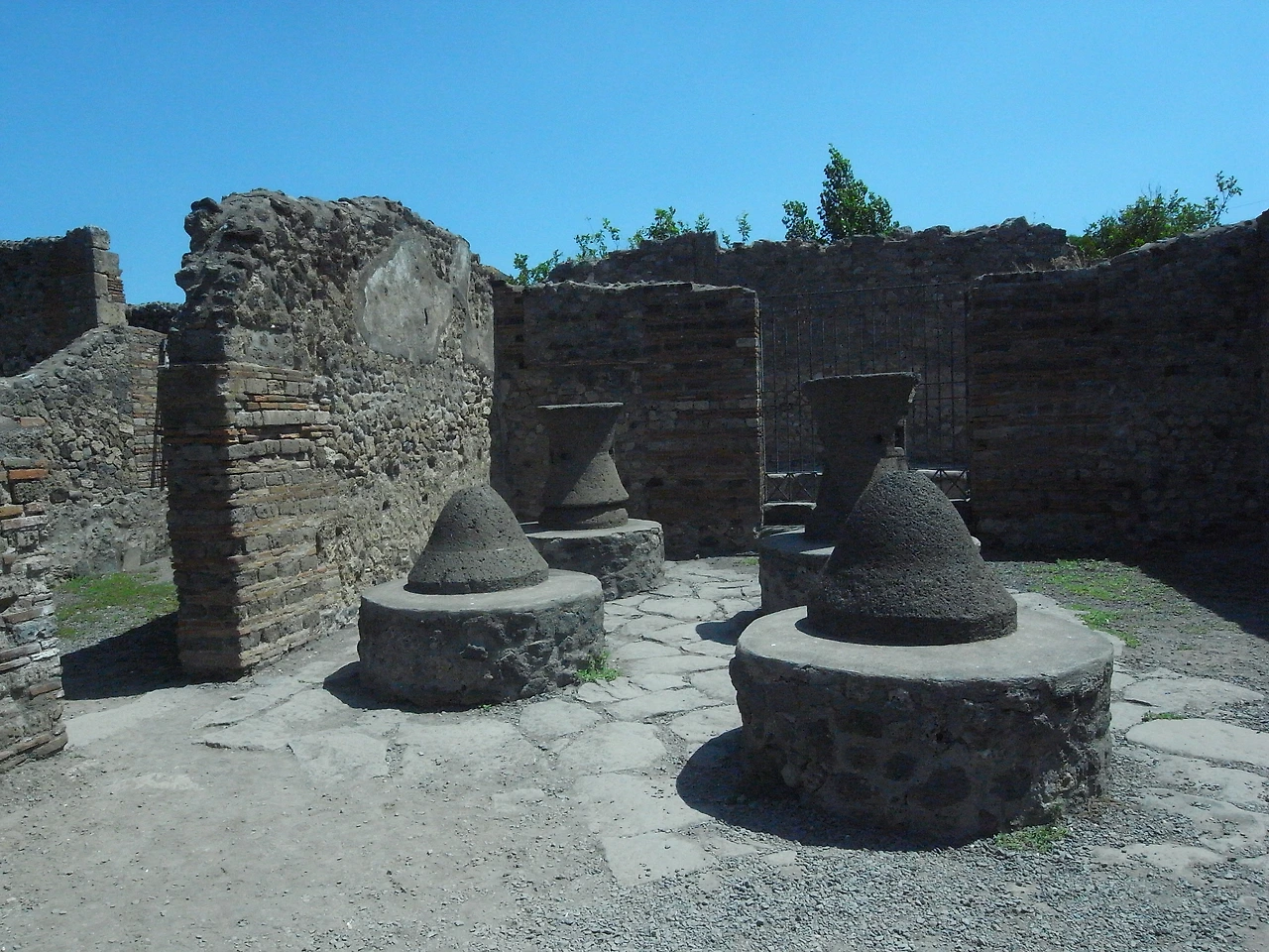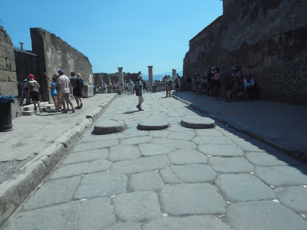 시가지에 자리한 주택과 상점의 집터를 둘러봤다. 잘 닦여진 포장도로는 큰 돌 사이사이 작고 흰 돌이 박혀 있었다. 작고 흰 돌은 밤길에 어둠을 밝혀주는 기능을 했다니, 고대인들의 지혜는 현대인에 뒤지지 않는 것 같다. 수준 높은 정화기능을 갖추고 있었다는 고대의 하수구도, 붉은 벽돌의 주택가 모습도 인상적이었다. 군데군데 무너져 내렸지만 많은 부분이 온전한 형태로 남아있는 집터가 세월의 흐름을 이겨낸 모습이 대견했다. 이렇게도 오래도록 남아있게 만들어 낸 폼페이 사람들이 경이롭게 느껴졌다. 벽면에 새겨진 그림으로 어떤 상점이었는지 알 수 있었고, 바닥에 셔터를 닫았던 문지방의 모습으로 일반적인 주택과 상점을 구분할 수 있었다. 번지가 남아있는 집터 벽에 가만히 손을 대고, 그 시대 사람들의 온기를 불러내 보았다.