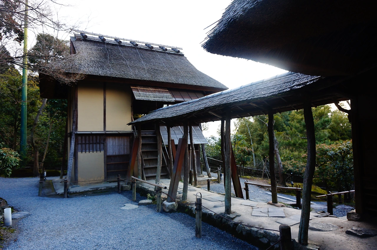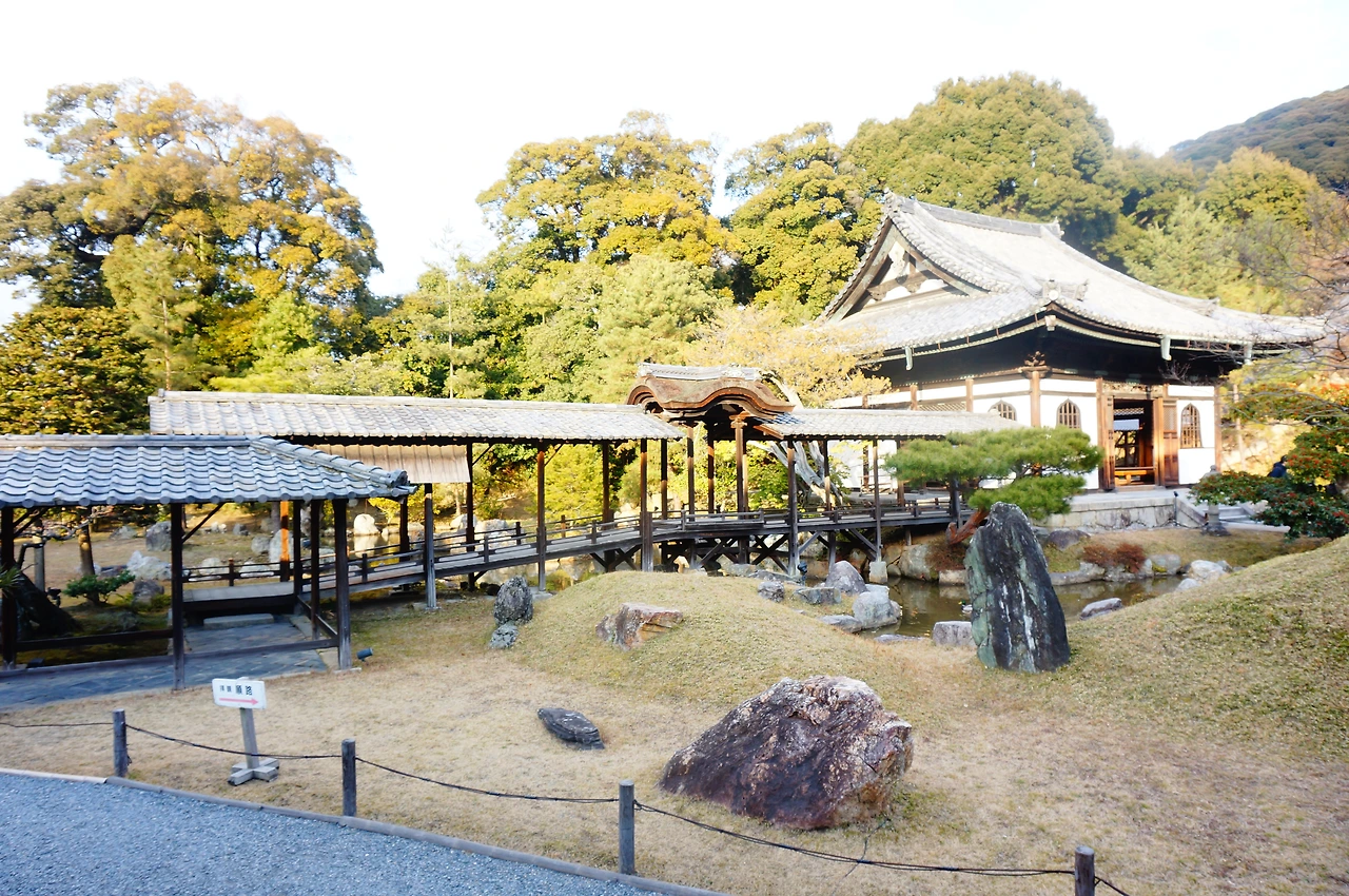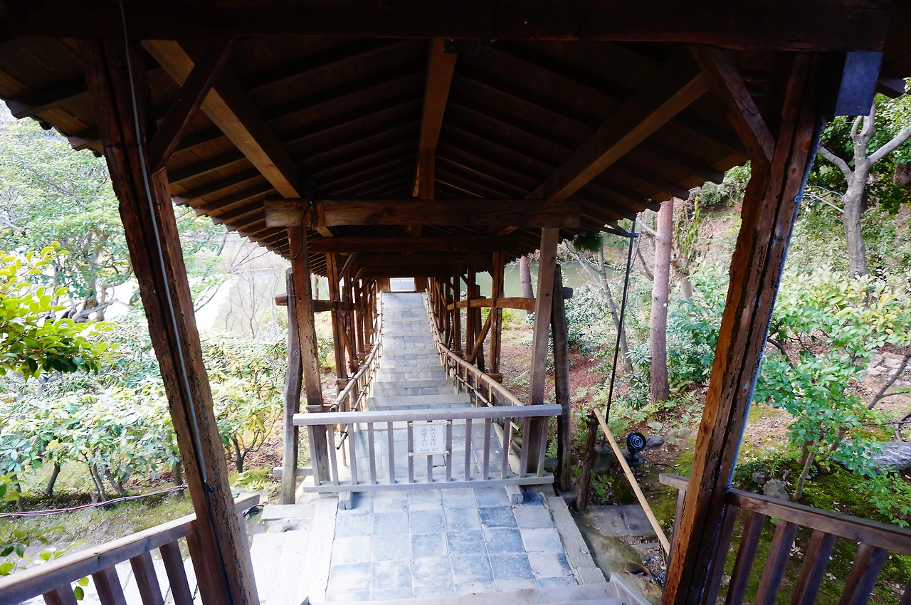 오래된 전각과 연못 등 볼거리가 풍부한 사찰, 고다이지(高台寺). 고다이지 뒤편 언덕에서도 이런 특이한 건축 구조를 접할 수 있었다. 야트막한 언덕 위까지 흔들다리마냥 아슬아슬하게 연결된 회랑을 한번 걸어보고 싶었는데, 너무 오래되어 그런지 출입을 제한하고 있었다. 고다이지 안에는 작은 초가가 있었는데, 너무 작아 굳이 회랑으로 이어줄 필요 없는 초가에도 회랑이 있었다. 회랑으로 이동하지 않아도 될 작고 아담한 작은 초가집에도 이런 구조가 있는 건, 어떤 필요 보다는 소담한 낭만을 위한 것이 아닌가 싶었다.