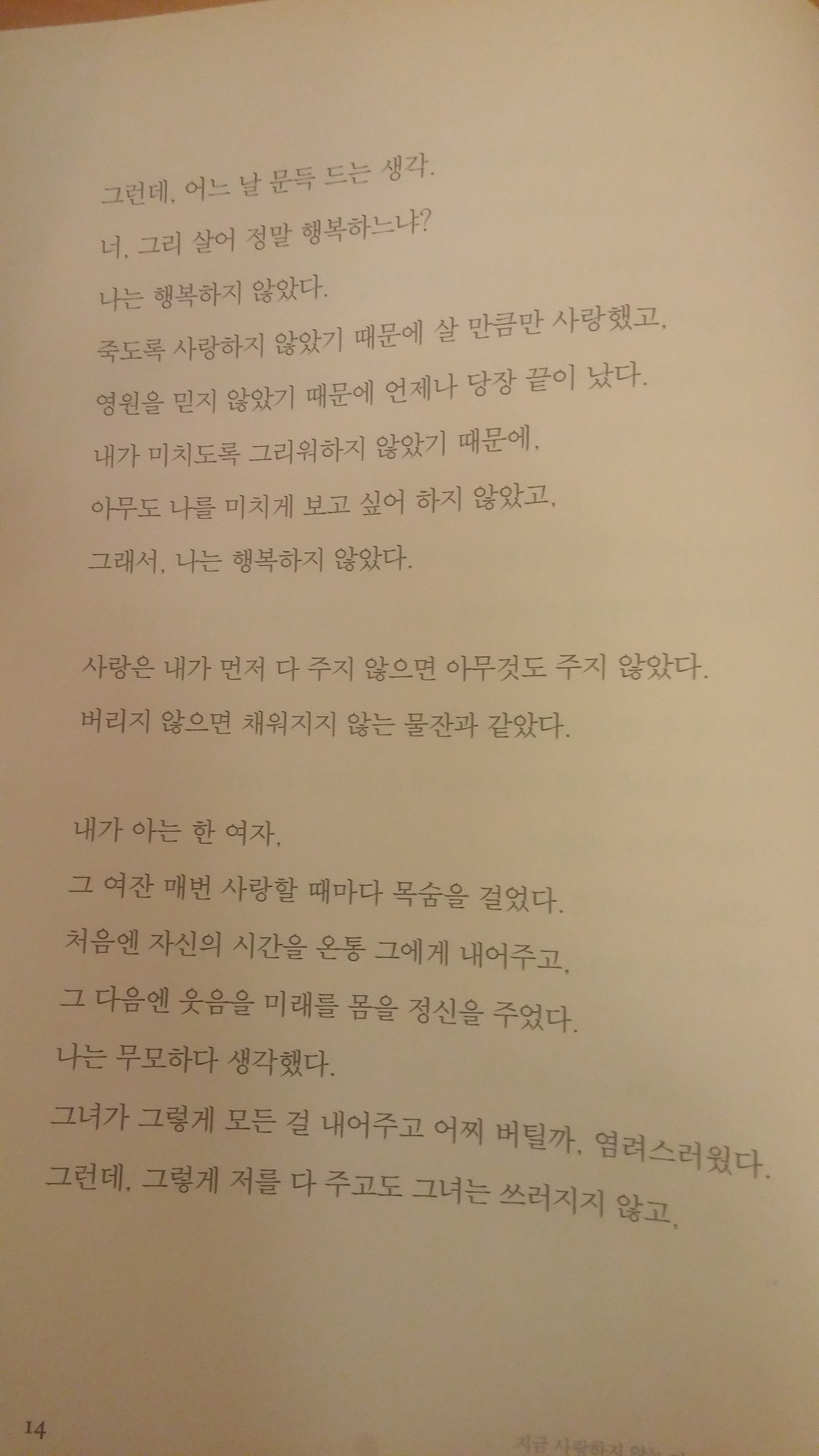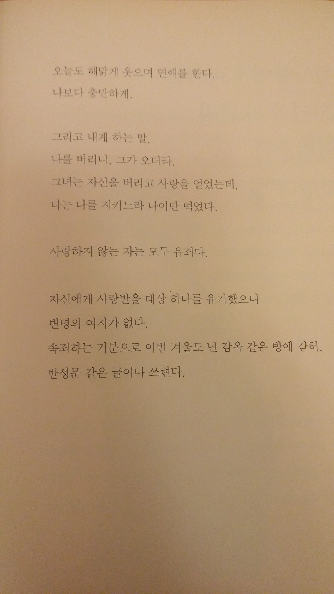 반성문과 같은 노희경의 글을 처음 읽었던 당시, 연애하고 있지 않았기에 잠시 발끈했지만, 잠잠히 생각해보니 진심으로 누군가를 위해 최선을 다해 본적이 있는지, 열렬히 사랑해 본적이 있느냐 하는 질문에 자신있게 답할 수가 없었다. 노희경의 말대로 나는 참 멋없게도 내 자신을 지키고자 애썼던 시간들을 보냈던 것이었다. 상처받는 것을 허용하는 것까지 사랑임을 깨달았고, 비록 찌질해 보일지언정 절대 냉소적인 삶을 살지 말자고, 용기내어 사랑하자고 다짐했다.