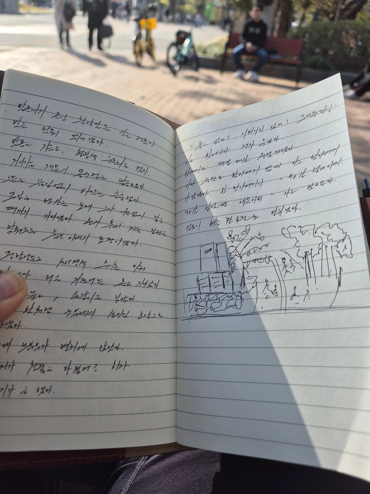 찹쌀떡처럼 하얀 여자들이 흰색이나 갈색 강아지를 안고 지나갔다. s는 강아지를 보는 척하며 여자들을 훔쳐봤다. 그떄 발목까지 흰 양말을 올려 신은 커플이 발을 맞춰 뛰어갔다. 발목은 가늘고 형광색 운동화는 컸다.