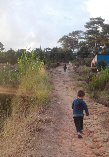 숙소에 도착해서 보니, 딸기밭이라기 보단 정원에 딸기가 몇 포기 심어져 있었고 딸기도 두어 개 달려 있었다. 브온(Vuon: 농장, 정원, 밭에 두루 쓰임)이란 베트남어 때문에 생긴 오해였을지도 모르겠다. 아들들은 소중한 딸기 두 알을 따서 나눠 먹었다. 정원인지 텃밭인지 산책을 하다 어느새 숙소를 벗어나 아무도 없는 시골 황무지 길과 마주하게 되었다. 해질 무렵 그 길을 아이들이 신나게 뛰어다니는데, 차도 없고 오토바이도 없었다. 어지러운 세계와는 동떨어져 우리만의 '낙원'에 와있는 기분이 들었다. 그래서 '파라다이스'였던 건가. 달랏 시내지만 전혀 다른 곳에 와있는 것 같은 이질감이 느껴지는 곳이었다.