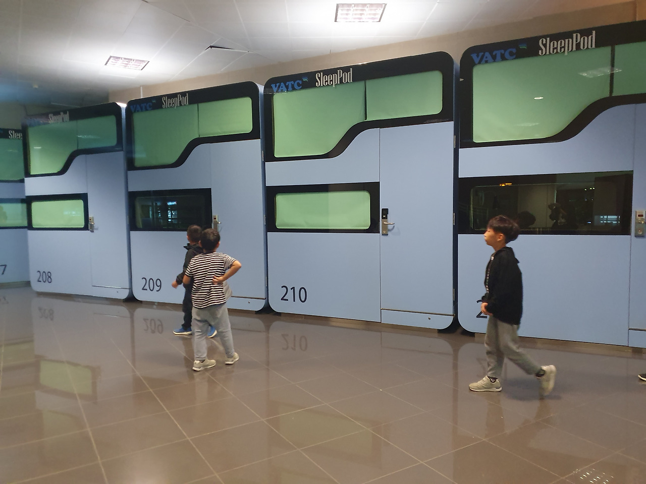 우리는 다음 날 가장 이른 시간인 6시 항공편을 예약했다. 공항 밖으로 나가서 자고 오기에는 불안했다. 또다시 비행기를 놓칠지도 모른다는 불안감에 공항에서 밤을 보내기로 했다. 공항에서 노숙이라니. 영화 터미널의 톰 행크스가 된 기분이다. 졸려서 눈이 가물거리는 아이들은 공항 의자에 누워서 잠을 청했다. 다행히 D가 4층인가에 잠깐 잘 수 있는 곳을 찾았다고 했다. 무인 슬립 팟(SleepPod). 몇 시간이라도 누울 수 있는 공간이 반가웠다. 복층으로 된 2인용 슬립 팟에 어른 둘과 아이 셋이 꾸깃꾸깃 들어갔다. 아이들은 금세 잠이 들고, 어른들은 뜬 눈으로 밤을 새우다시피 하고 꾀죄죄한 몰골로 티켓팅을 했다. 이번에는 다행히 무사히 비행기에 올랐다. 안도와 함께 눈을 감았다 뜨니 호치민에 도착했다.