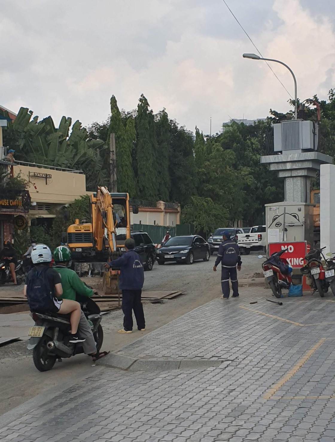 "꿕흥(Quoc Huong st.) 쪽에 물이 도로에 넘쳐서 바퀴가 다 잠겼어요. 꿕흥 말고 다른 길로 오세요"