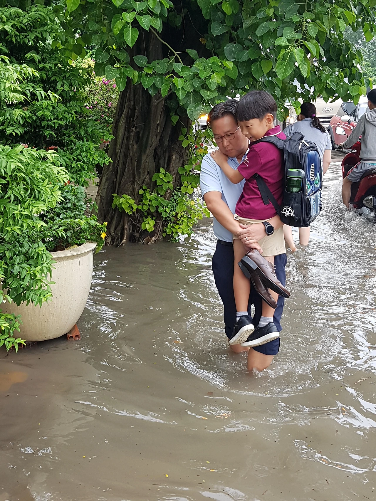 물에 잠긴 꿕흥st. / 아빠는 심각한데 아들은 신난 우기 아침 등교 풍경