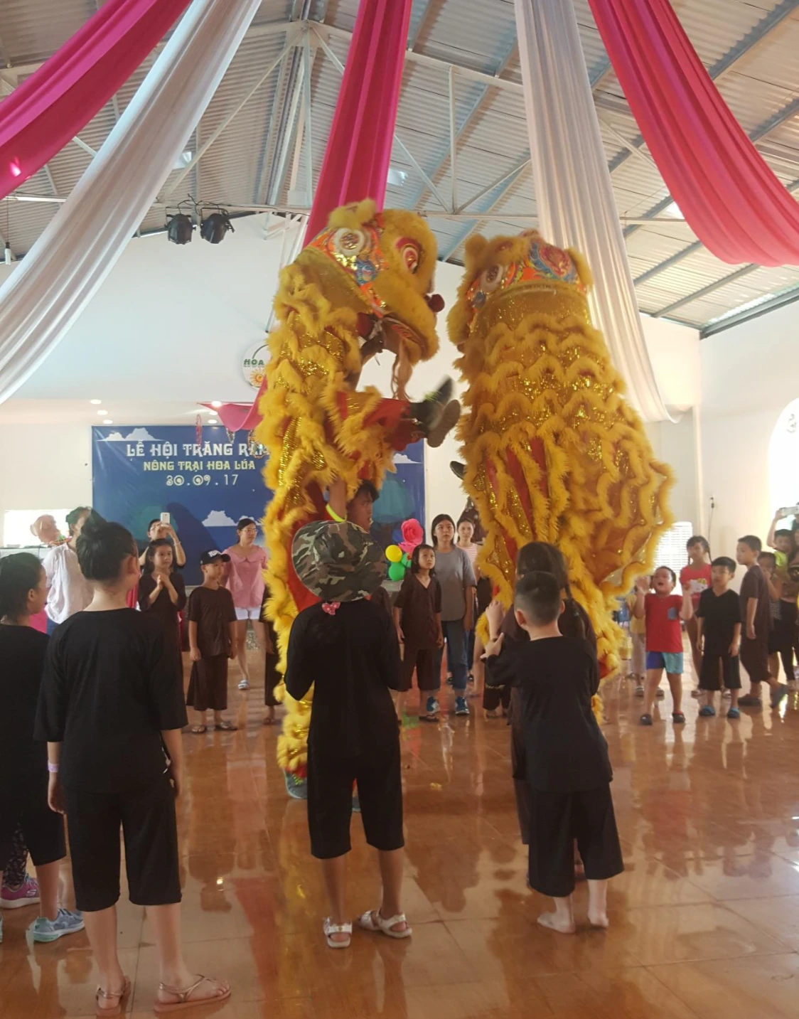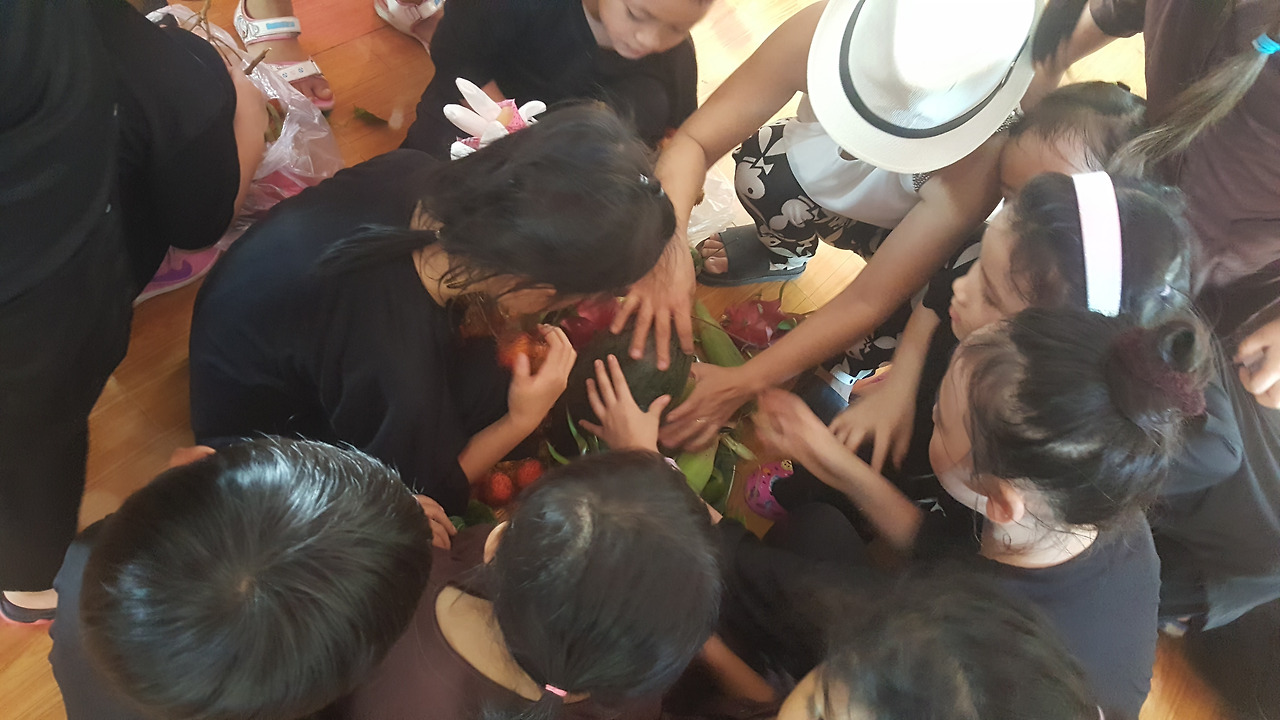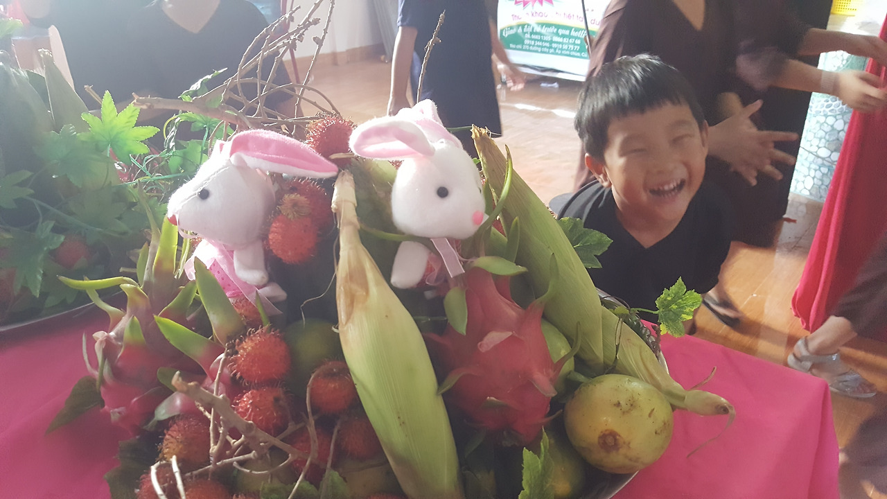 베트남은 전통적으로 설이나 추석 같은 명절에는 여러 가지 과일로 예쁘게 장식해 제단이나 집을 꾸민다. 여기서도 아이들을 여러 그룹으로 나눠서 어느 팀이 과일 바구니를 더 예쁘게 꾸미는지 대회를 열었다. 과일과 인형은 잔뜩 쌓여 놓았지만, 손이 빨라야 원하는 과일과 인형을 가져올 수 있었다. 남자아이들이 재빨리 과일과 인형을 가져오면, 여자들이 예쁘게 꾸미기 시작했다. 어쩌다 보니 우리 아들들이 속한 그룹이 대회에서 1등을 했다. 우리 아들들이 이 대회에서 어떤 역할을 했는지 잘 모르겠지만, 아이들은 자기 팀이 1등을 했다니 그저 신났다. 말이 잘 안 통해 겉돌까 걱정했는데, 다행히 즐거워하는 것처럼 보였다.