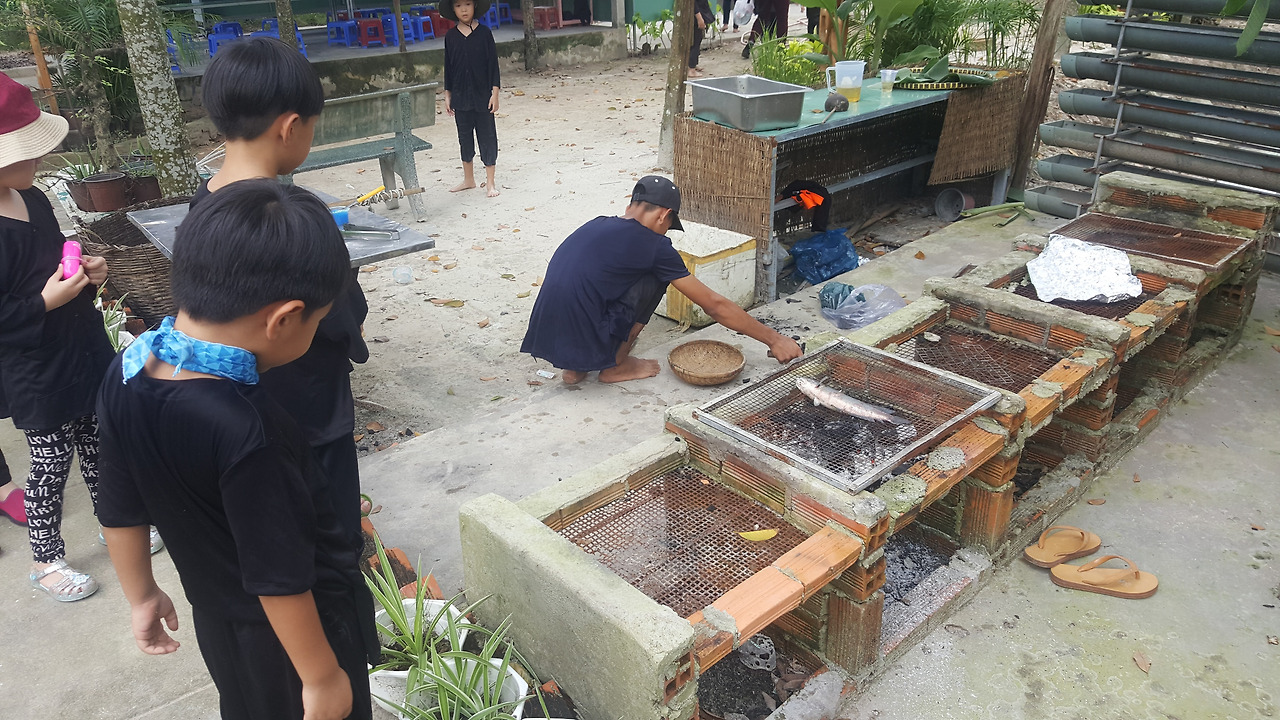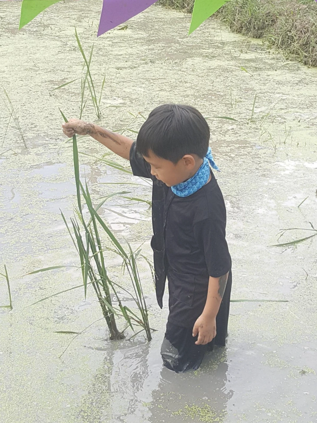 귓가에 울리는 스피커 소리에 정신을 놓을 무렵 다행히 체험장에 도착했다. 모든 일정은 베트남어로 진행되고 있었지만, 외국인이 있다는 걸 알고 주최 측에서 영어가 가능한 전담 직원을 붙여 주었다. 친구 엄마들도 간간히 진행 상황을 영어로 통역해주었다. 다행이었지만, 직원은 바빴고, 엄마들은 대부분 본인 아이들을 돌보느라 정신이 없어 보였다. 멋모르고 돌아다니다간 미아 되기 십상이었다. 우리는 무조건 친구들을 놓치지 않고 따라다니고, 눈치껏 친구들을 따라 하기로 했다. 이곳에서 우리는 벼 농장 체험과 함께 서바이벌까지 체험하게 되었다.