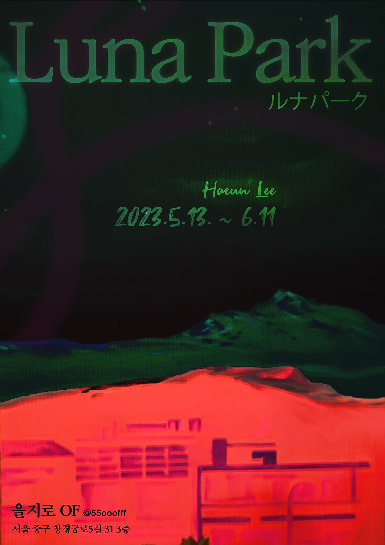 <<루나파크>>라는 이하은 작가 개인전은 전시 공간 ‘오브’의 오웅진 대표의 기획으로부터 시작된다. 최첨단 기술 기반 예술인 ‘아트테크(Art-tech)’ 밖에서 미디어 매체를 고민하고 있는 오웅진 대표에게 전통적인 두 매체인 ‘회화’와 ‘달’은 기획자로서 결코 지나칠 수 없는 소재이다. 을지로 오브(of)가 현재 자리하고 있는 을지로 4가는 1910년대 당시 행정지역 명칭이던 경성부 과거 황금정 4정목 부근이다. 『매일신보(每日申報)』 1913년 6월 22일자 「황금 유원(黃金遊園)의 별건곤(別乾坤)」 기사에 따르면 경성 남부 산림동 바로 오브가 있는 이 동네에 최초 민간 유원시설로서 ‘황금 유원’이라는 ‘루나 파크(ルナパーク)’가 경성으로 ‘안락한 여행’을 오는 사람들을 늦은 오후 4시에서 밤 11시까지 맞이했었다고 한다. 예술작품을 선보이며 사람을 환대하는 전시 공간 오브가 이러한 황금 유원의 기능을 잇고 있다고도 볼 수 있다. ‘월세계(月世界)’라는 뜻의 루나 파크는 예술과 근대문명의 산지인 유럽에 영향을 받아 여가와 소비를 지향한 유럽문화로부터 만들어지게 되었다. 가득한 달빛을 암시하는 황금, 월 세계, 달은 한국인에게 특별하다. 만월(滿月) 아래 불놀이를 통해 건강과 풍년을 염원하거나 꾸준히 변하고 반복을 하는 달에 술잔을 기울이며 시리고 애잔한 천만가지 심상을 문학과 시로 실어온 달은 우리 문화에서 익숙하다. 이번 이하은의 개인전 <<루나파크>>는 1910년대 성행한 근대유원지 이름에서 영감을 받은 기획자와 작가 간 대화로 시작됐지만 무상하게 언제나 존재해온 달 아래 세계의 진리를 묻는 작가의 세계로의 초대이기도 하다. 늘 펼쳐져있고 내던져져 고심한다. 이번 개인전 작품들을 통해 달에 심상을 싣듯 영원과 한 끗 차이인 찰나의 시공간을 경험하길 바란다.