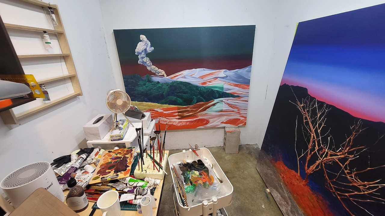 작가는 다양한 지형을 탐색하고 두 개 이상의 지질 등의 객체 이미지들을 겹쳐보면서 공통감과 이질감을 연구한다. 자연현상들에 관심을 갖고 기이한 기후가 보여주는 형상과 그로인한 풍경들에서 작품의 내용적 시원을 찾는다. 틀 속에 개입한 틀 안팎에서 이질적인 성질들 간 만남을 주선하는 취미를 갖고 있으며 이웃한 객체 간 온도차 점검을 통하여 특유의 색을 추출하여 결과로서 칠한다. 대지 너머 노을을 띤 하늘은 우주적 활동으로 마치 다른 행성에서 반사 받아 생성된 듯 발광적 빛깔을 자아낸다. 작가의 회화에 자주 등장하는 산 땅 노을 하늘 풀이라는 객체들에 대해 이미 알고 있다고 생각해 왔지만 작품을 통해 각 객체에 다시 의문을 품게 하며 인간 감상자가 주의를 기울여 찾아낸 단서를 지속적으로 의심하게 만든다. 믿음도 지식도 작동하지 못하는 작가 특유의 세계를 만들어 시간 감각마저 무력하게 하는 탁월함을 추구하고 있다. 초연결사회인 포스트인터넷 시대 21세기 화가는 무엇을 하고 있는지 보여주는 대목이다. 작가는 평면작품들을 통해 기술을 동료삼지 않아도 어떤 방식으로 시공간을 다룰 수 있는지, 회화의 제요소들로 실재(reality)를 어떻게 탐색할 수 있는지 고심하고 있다.