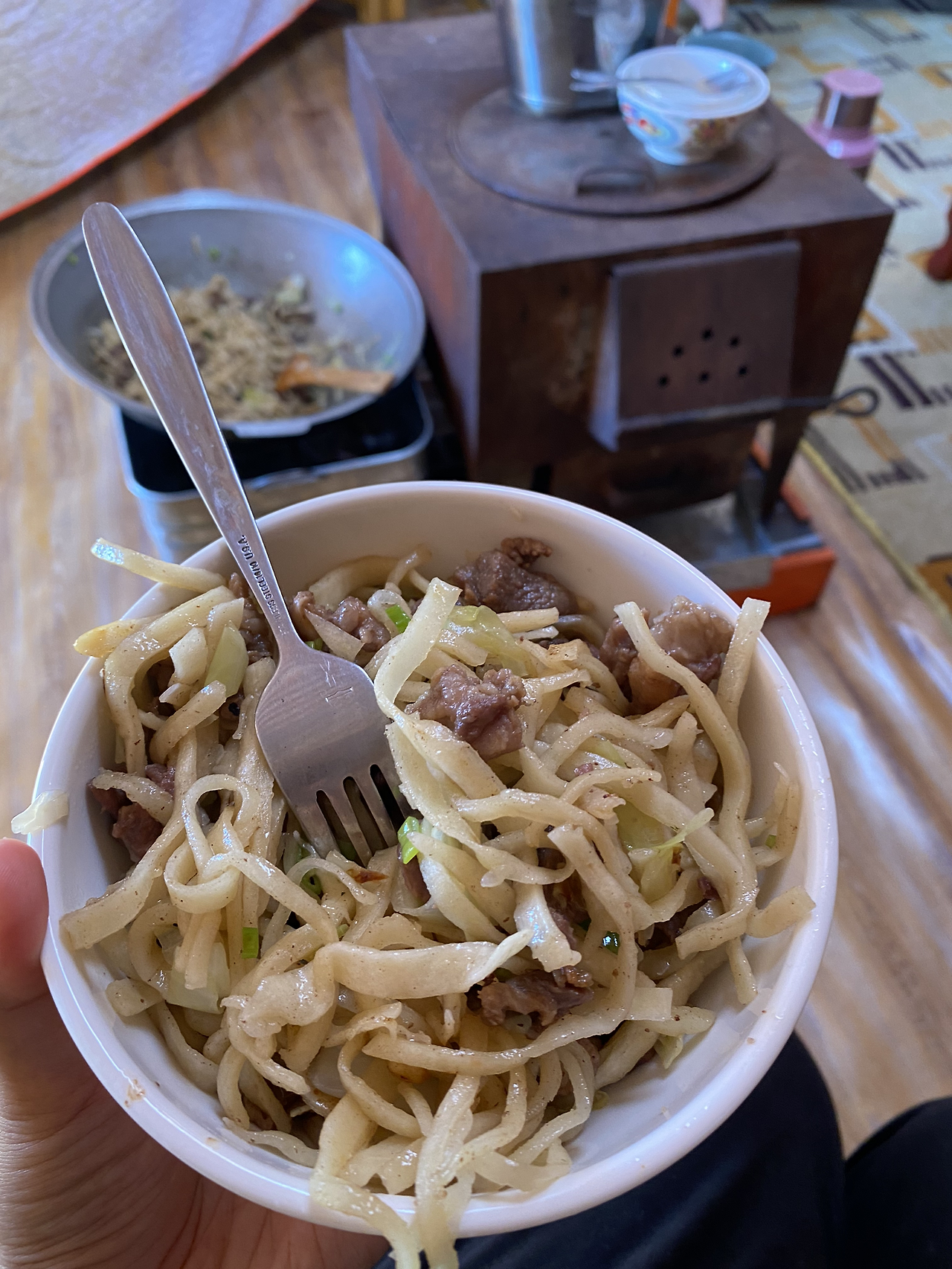 나중에 유목민 집에서는 랍샤에 당면을 넣어주었다. 이건 우리가 아침 식사 시간을 놓치는 바람에 국물이 사라져 볶음당면처럼 되어 버렸지만 맛있게 먹었다.