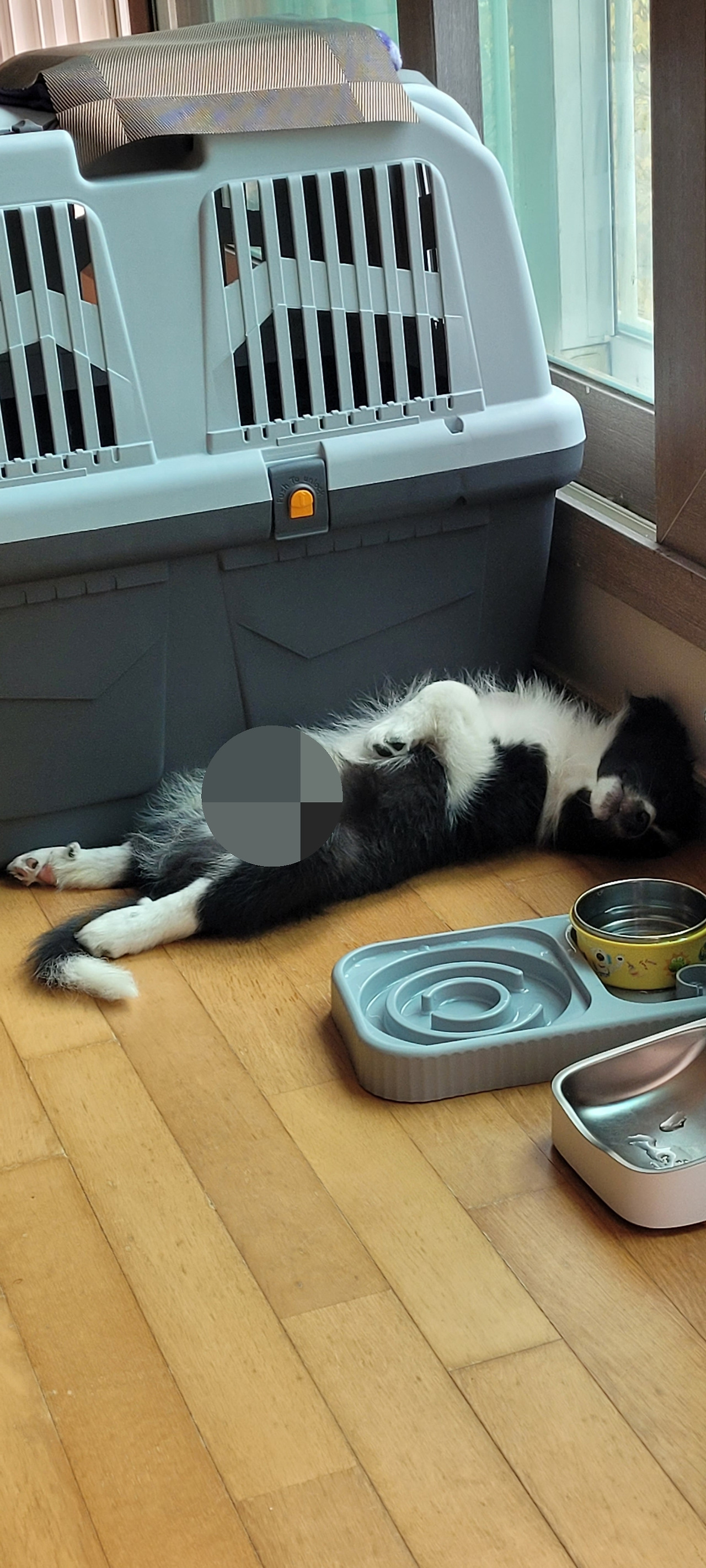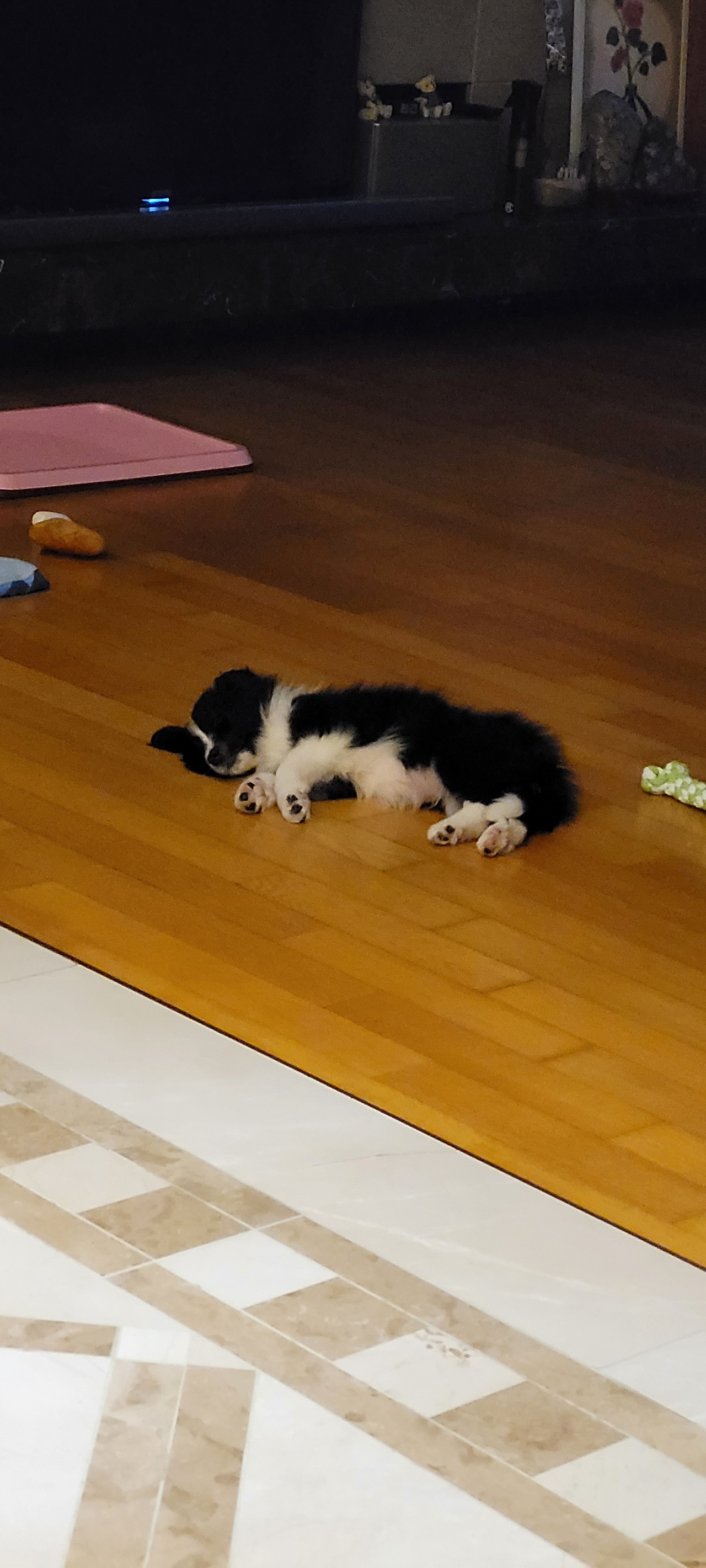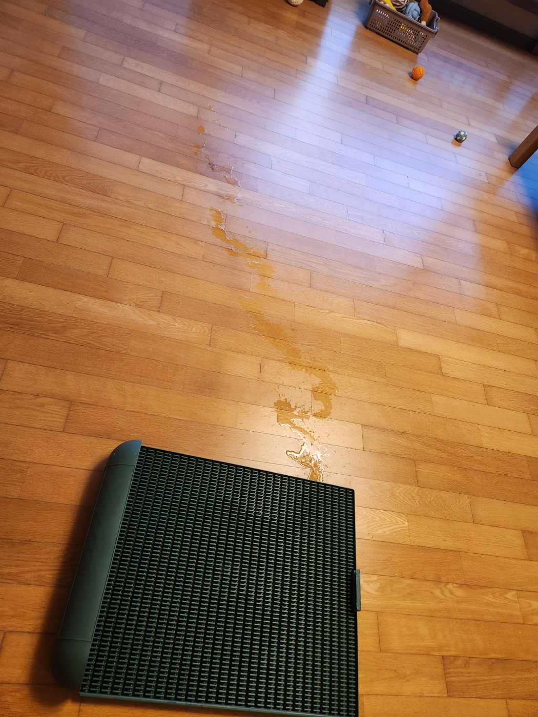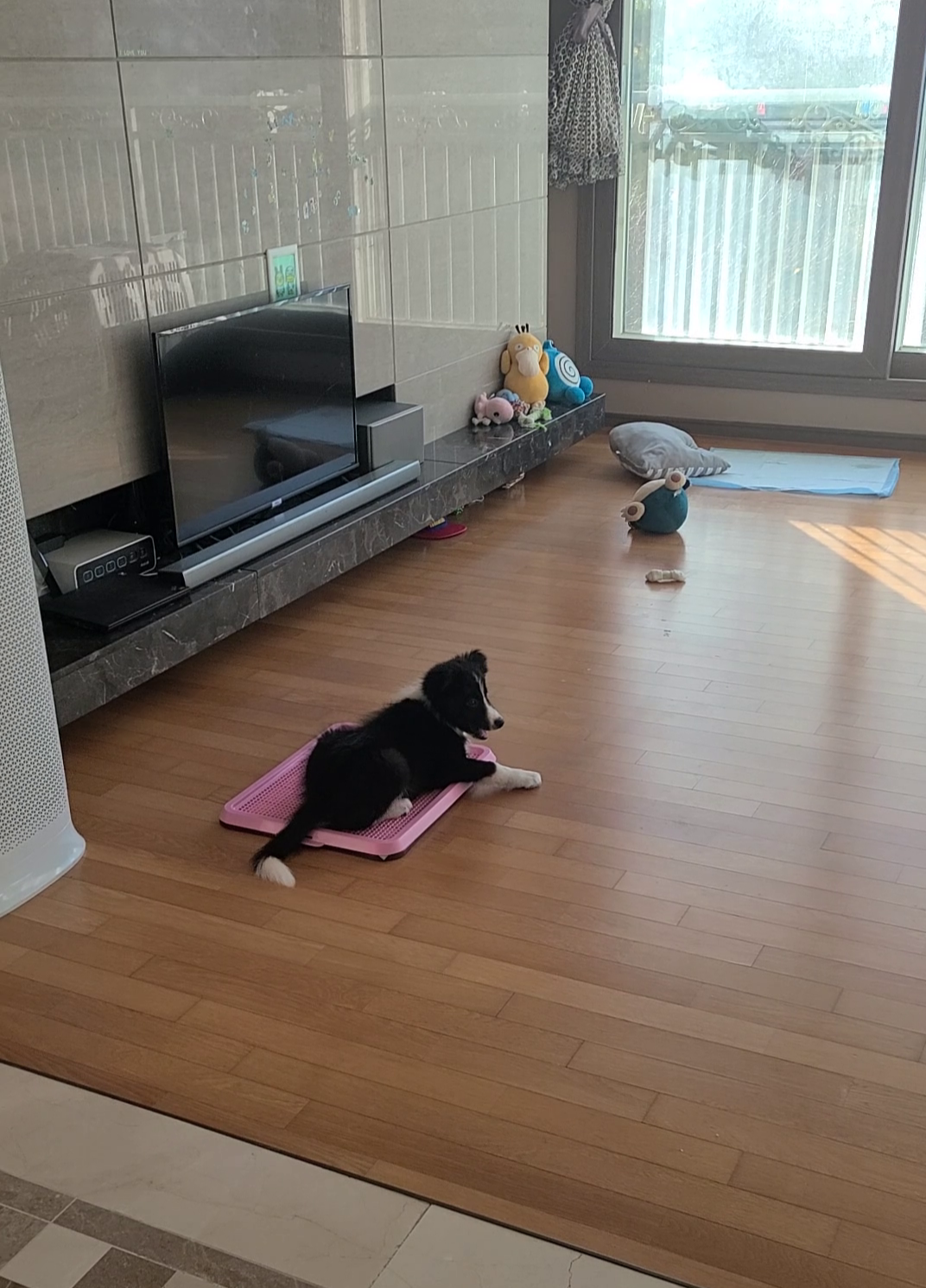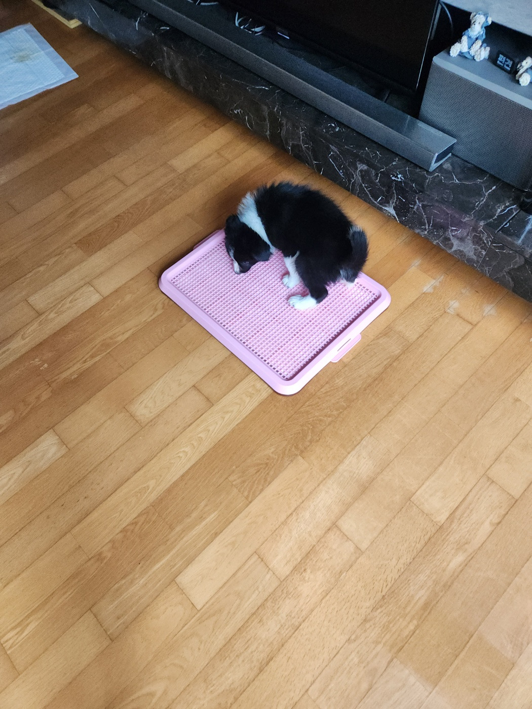 무엇이 문제일까? 곰곰이 생각한 끝에 장소가 일정하지 않은 것이 문제인 듯하다. 그동안 조금씩 이곳저곳 위치를 바꿨었다. 거실 한편에 일정한 장소를 정하고 배변 판과 주변에 약간의 패드를 함께 두었다. 이번에는 배변 유도제도 함께 뿌려 주었다. 한 달 정도 꾸준히 지켜봤다. 유도제가 효과가 있는 것인지 그럭저럭 잘한다. 깔끔하지는 않아 주변을 조금 치워야 하지만 어쩔 수 없는 것 같다. 그에게 너무 많은 것을 바라고 있는 것 같다. 장소 구분 없이 그냥 잘 놀고 잠도 많다. 잘 놀다가도 피곤하면 아무 데서나 눕는다. 어릴 때는 원래 잠이 많다고 한다. 그렇게 한 달 정도 지났는데 많이 자랐다. 이제 배변 판이 작다.