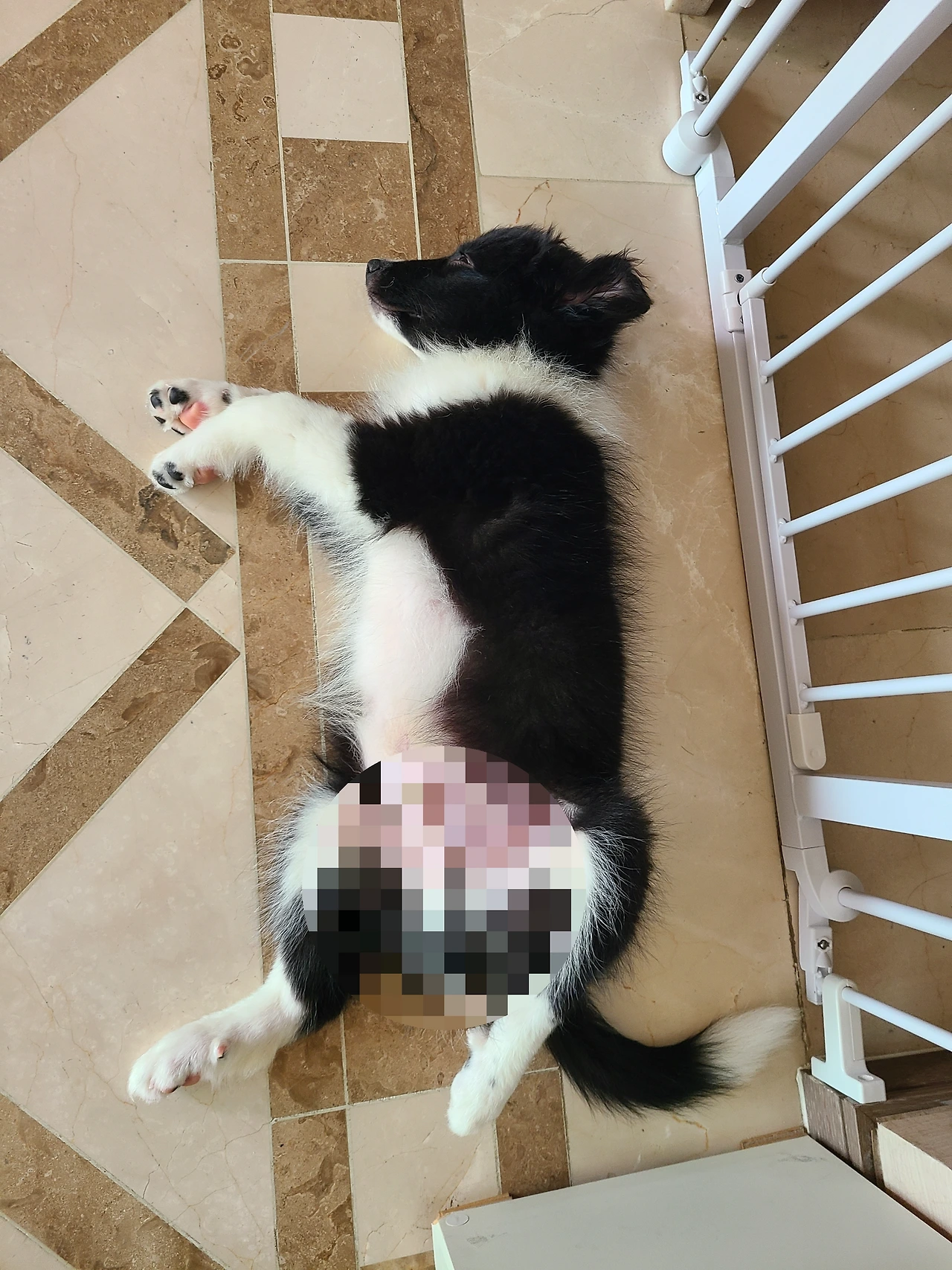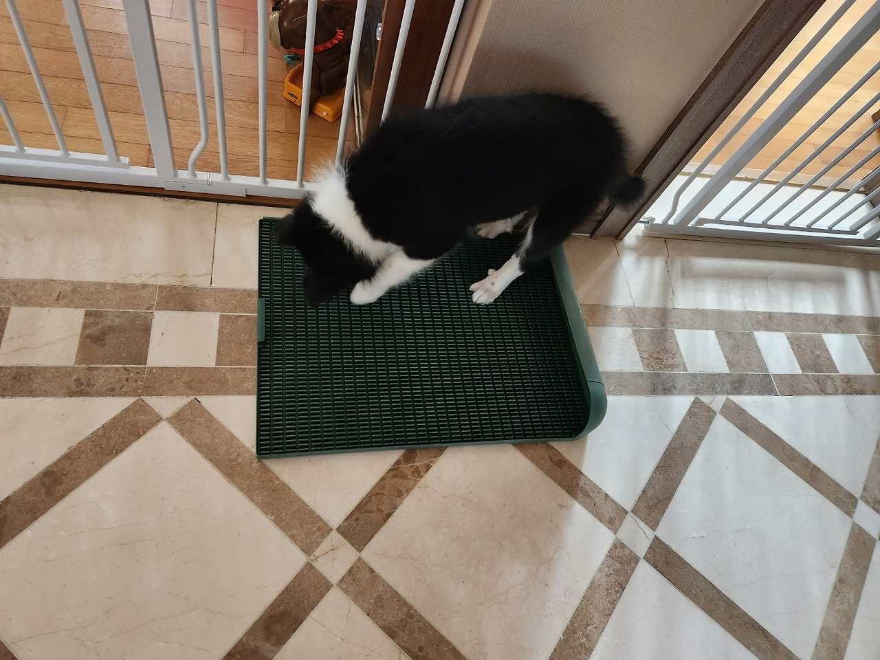 너무 트인 곳이 문제인가 싶어 반쪽이 막힌 우리를 구매했다. 처음에는 그럭저럭 잘하는 듯했지만 이 역시 실패다. 오히려 좁고 밀폐된 공간이어서 청소도 더 힘들고 지저분했다. 잠시 가두어 둘 공간으로도 함께 사용하려고 했지만, 가두어 둔지 얼마 지나지 않아 철창 위로 넘어 다닌다. 요즘 애들 말로, '헐~'이다. 미처 보더콜리 종의 크기나 활동량을 생각하지 못했다. 이후로 그를 줄자로 재보는 습관이 생겼다. 고이 잘 접어서, 바로 당근행이다.