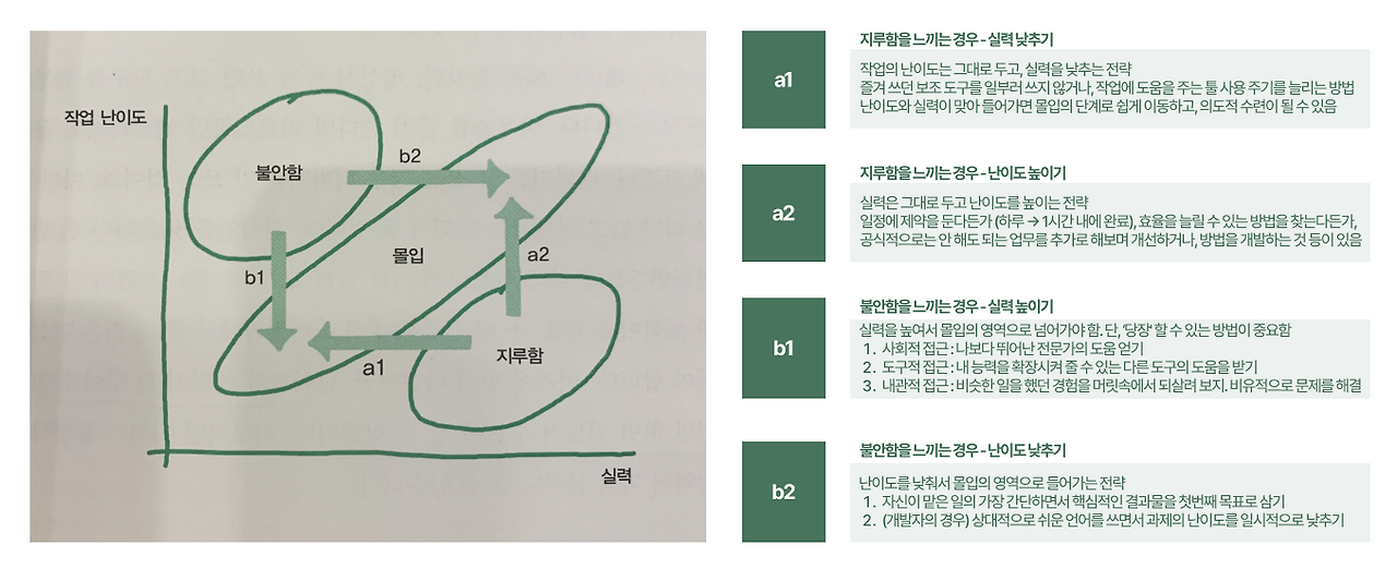 이를 위해서는 끊임없이 나의 상태를 알아차리고(mindfulness), 작업의 난이도에 따라 불안함이나 지루함을 느낀다면 적절한 전략을 사용해야 한다. 의도적으로 난이도를 높이든, 효율적으로 일을 개선하려고 노력하든, 도구의 도움을 받든, 단계를 나누어 가든!