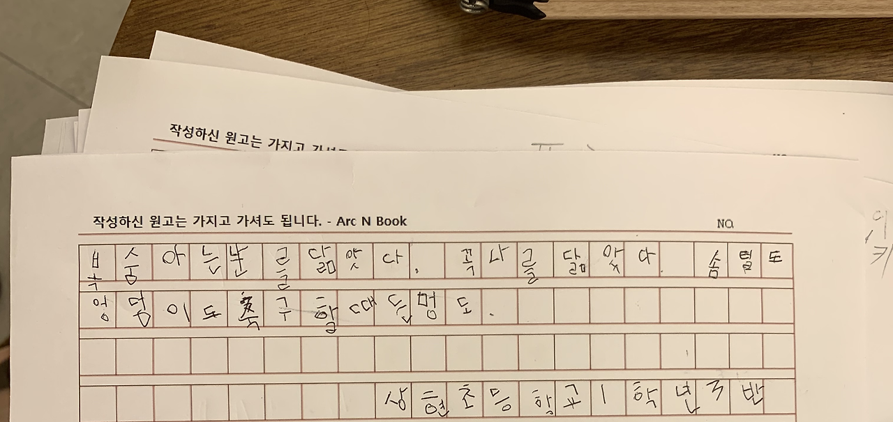 서점 한 켠에 원고지 모양의 종이가 있었다. 책을 가까이할 겸 마음껏 필사해보라는 하나의 체험 코너였다. 이미 왔다 간 이들의 흔적들이 테이블 곳곳에 남아있었다. 나도 슬쩍 해볼까, 하며 종이를 들추는데 이런 글이 있었다. 초등학교 1학년 친구가 적어 둔 귀여운 시였다.