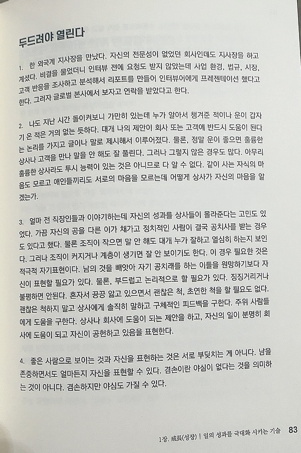 - 나도 지난 시간 돌이켜보니 가만히 있는데 누가 알아서 챙겨준 적이나 운이 갑자기 온 적은 거의 없는 듯하다. 대개 나의 제안이 회사 또는 고객에 반드시 도움이 된다는 논리를 가지고 글이나 말로 제시해서 이루어졌다.