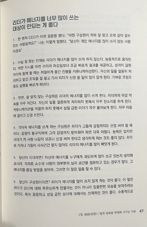 - 당신이 구성원이라면? 리더가 에너지를 많이 쓰지 않게 하는 것이 좋다. 이 말은 리더가 당신에 대해 무관심하게 만들라는 것이 아니라 믿을만한 모습을 보여주라는 것이다.