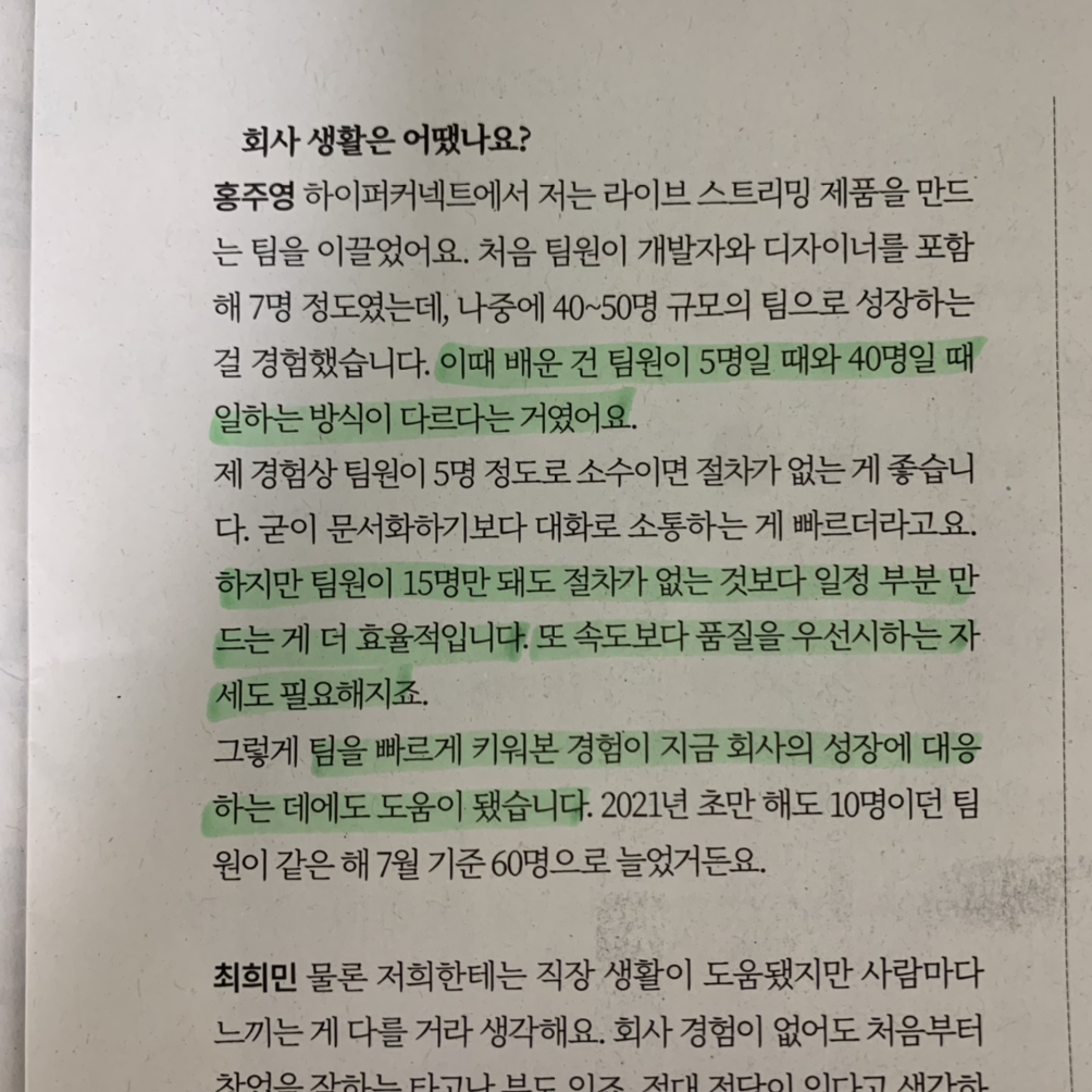 팀원이 5명일 때와 40명일 때의 일하는 방식의 차이. 팀원이 소수이면 절차가 없이 대화로 소통하는 것이 빠르고 효율적인 반면, 15명만 돼도 절차를 만드는 게 더 효율적이고 품질 또한 우선시하는 자세가 필요함. 팀을 빠르게 키워본 경험이 지금 회사의 성장의 대응에도 도움이 됨