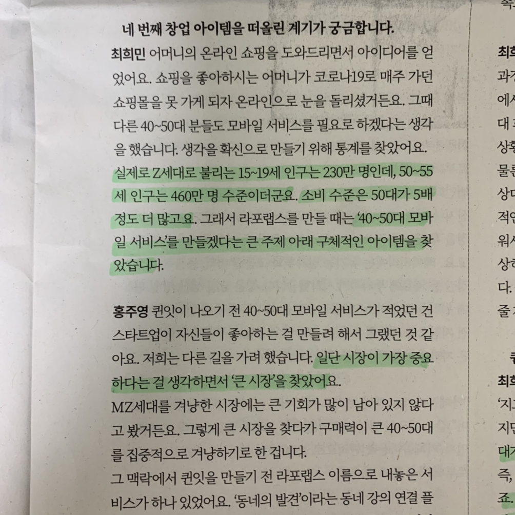 그런데 이번달 폴인페이퍼에 바로 이 퀸잇 창업자 - 라포랩스 공동대표(최희민/홍주영) 두 분의 인터뷰가 나왔다. 사실 단순 기사 요약이나 후기는 브런치에 옮겨적지 않으려고 하는데, 인터뷰 내용이 인상적이고 또다른 영감을 줘서 꼭 기록해두려고 한다.