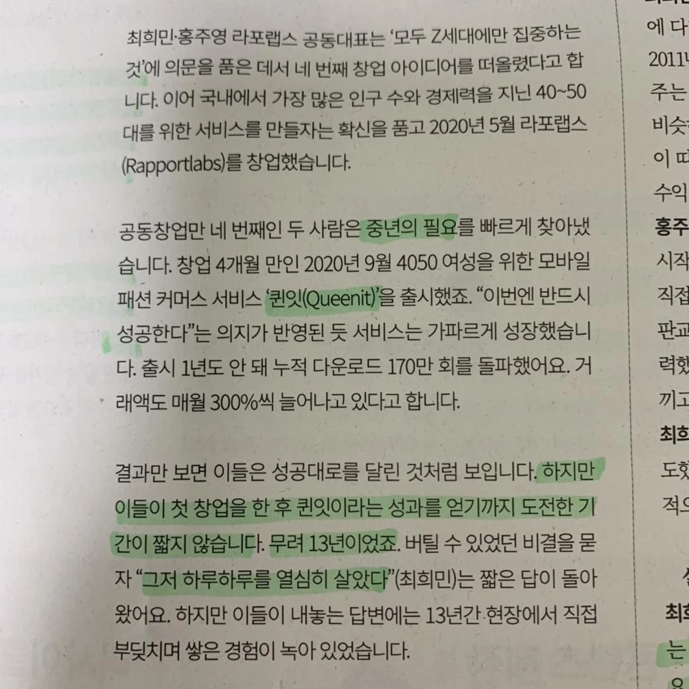 …이들이 첫 창업을 한 후 퀸잇이라는 성과를 얻기까지 도전한 기간이 짧지 않습니다. 무려 13년이었죠. 버틸 수 있었던 비결을 묻자 “그저 하루하루를 열심히 살았다”는 짧은 답이 돌아왔어요. …