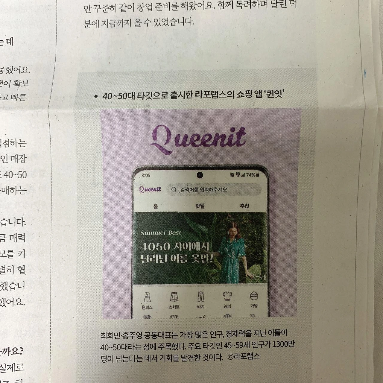 한창 더웠던 올 여름 어느 날, 엄마가 원피스를 한 벌 골라달라고 카톡으로 링크를 하나 보내줬다. 앱을 설치하고 보니 ‘퀸잇(Queenit)’이라는 처음 보는 서비스. 4050을 여성을 위한 모바일 쇼핑 앱이란다. 내가 쇼핑할 때 지그재그를 열듯, 우리 엄마는 퀸잇을 여나 보다. '타겟층이 명확하네, 어떻게 이런 생각을 했지?' 신기해하며 설치했던 기억이 난다.