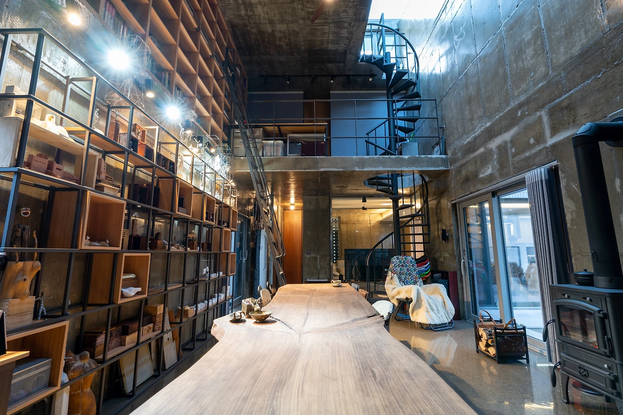 복층구조인 살롱공간은 1층의 조각작업공간과 2층 민화 작업공간으로 분리되어있다. 상대적으로 무거운 재료를 다루는 조각작업은 1층, 펼쳐놓고 작업해야 하는 민화는 2층으로 위치하여 손님의 활동으로부터 방해받지 않도록 했다. 부부의 작업실은 분리되어 있지만 시야적으로 한 공간에 있어 소통되도록 했다.