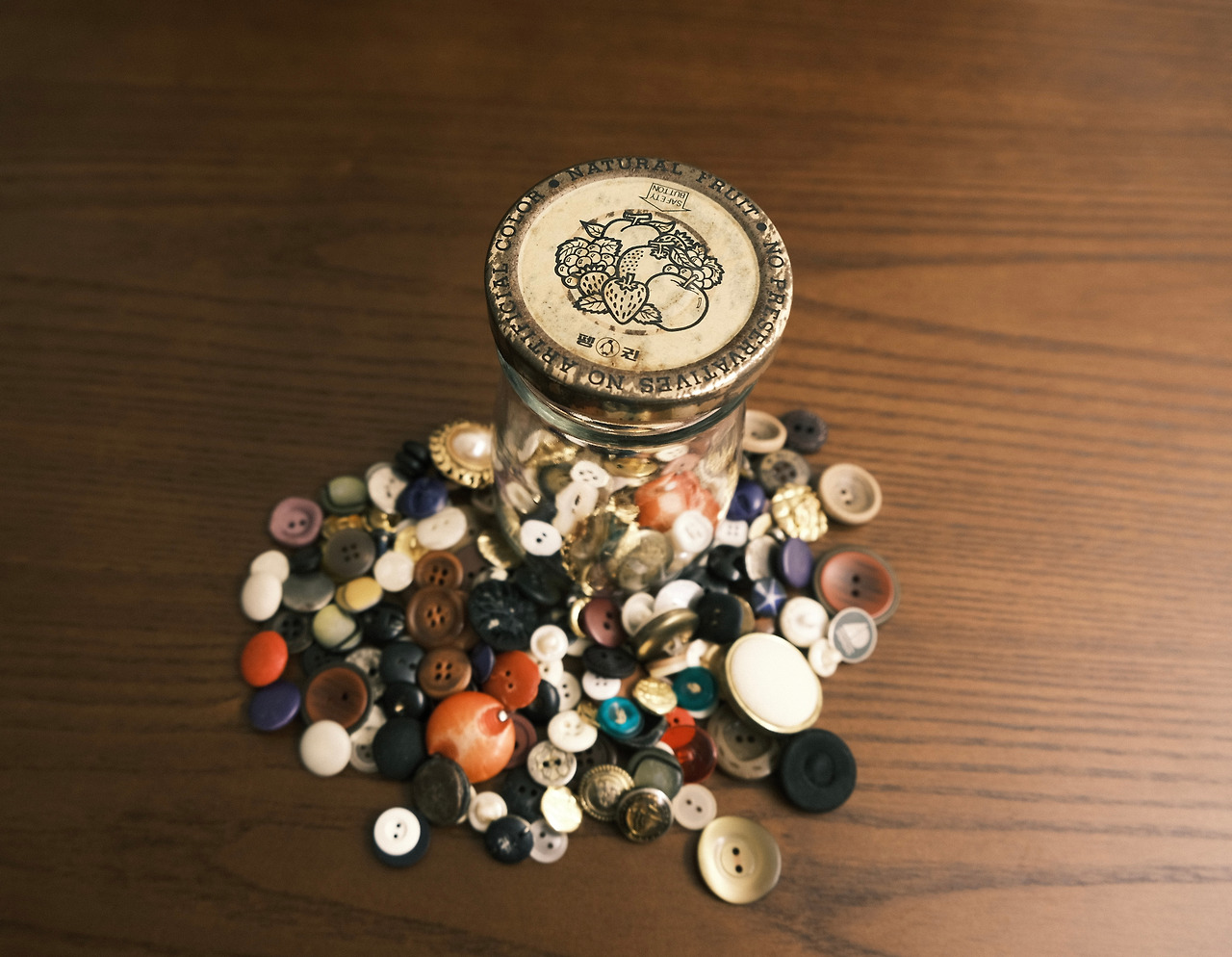 생활을 위한 사소한 물건 중 하나여서일까. 언제부터였는지 묻는 나의 질문에 까마득하다는 얼굴이다. 그저 남은 단추를 빈 병에 둔 것뿐이지만, 손끝으로 스쳐갔을 무수한 일상의 장면들이 나를 잡아끈다. 잼통에 묻어나는 할머니의 시간을 어루만지면, 어쩐지 배고픈 마음이 조금 달래지는 것 같다.