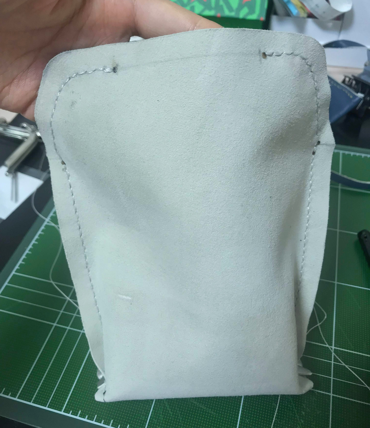 입구 부분을 제외한 나머지 세 면을 바느질해 봉합해 주었다. 바느질을 오랜만에 하다 보니 첫 시작 부분마다 매끄럽지 않아 조금 애를 먹었는데 그래도 머릿속으로 차근차근 되짚어가며 해보니 다시 페이스를 찾을 수 있었다. 구멍의 간격이 일정하기 때문에 솜씨나 힘 조절에 따라 봉제선이 삐뚤빼뚤할 염려가 없어 좋고, 하다 보면 잡념도 사라지고 온전히 집중할 수 있는 나만의 시간을 가지게 되어 가죽공예에서 참으로 좋아하는 구간이다.