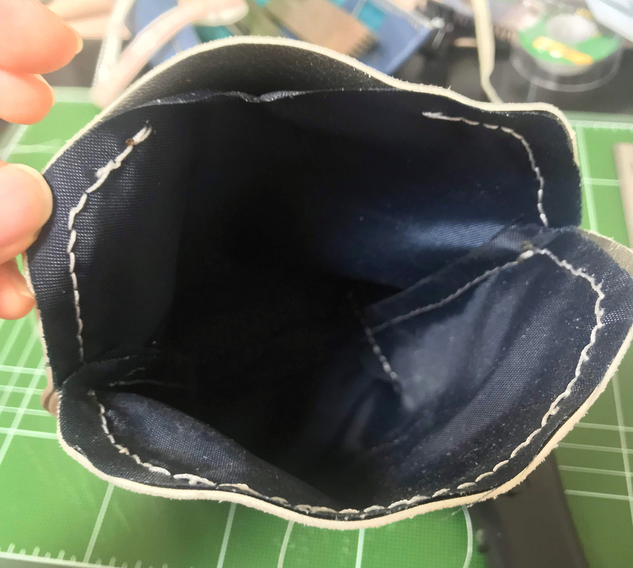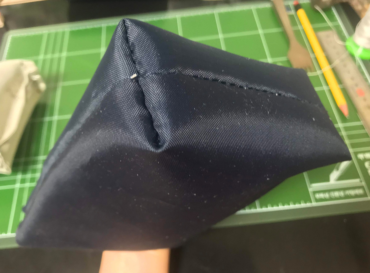 안감으로 사용하는 원단도 지금까지와 동일한 방식으로 바느질한다. 그리고 사진처럼 가방 하단의 모양을 잡아 수평이 맞도록 양 끝을 수직으로 바느질해 준다. 가방 하단부에 입체감이 생기면서 물건을 넣을 수 있는 공간이 확보된다. 바느질되는 길이가 같아야 가방의 균형이 맞고, 이 길이에 따라 가방 하단부의 너비가 결정되기 때문에 꽤나 신경 써서 작업한 부분이다. 어차피 뒤집으면 보이지 않을 부분이라 바느질은 예쁘기보다는 튼튼하게 하는 데에만 집중했다.