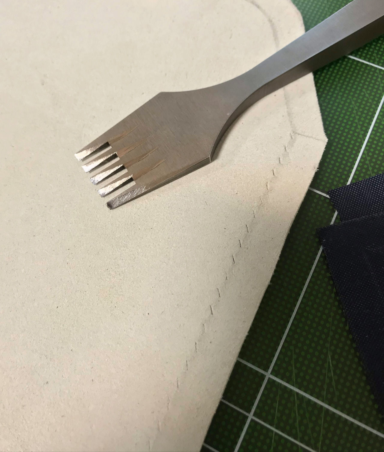 이제 한 쌍의 가죽을 연결해 가방의 형태를 잡을 차례다. 가죽 겉면끼리 서로 맞닿도록 두 장을 겹쳐 놓은 뒤 가죽이 움직이지 않게 잘 고정한다. 그리고는 바늘구멍을 만드는 도구(치즐)를 이용해 가지런하게 구멍을 내준다. 치즐을 가죽 위에 올리고 망치로 탕탕탕 두드리면 치즐의 날이 가죽을 관통해 구멍이 생기는 방식이다. 망치를 사용해야 해서 매우 시끄러운 작업이지만 그래도 가지런히 줄을 잇는 구멍들을 보면 뭔가 마음도 같이 차분해지는 기분이 든다.