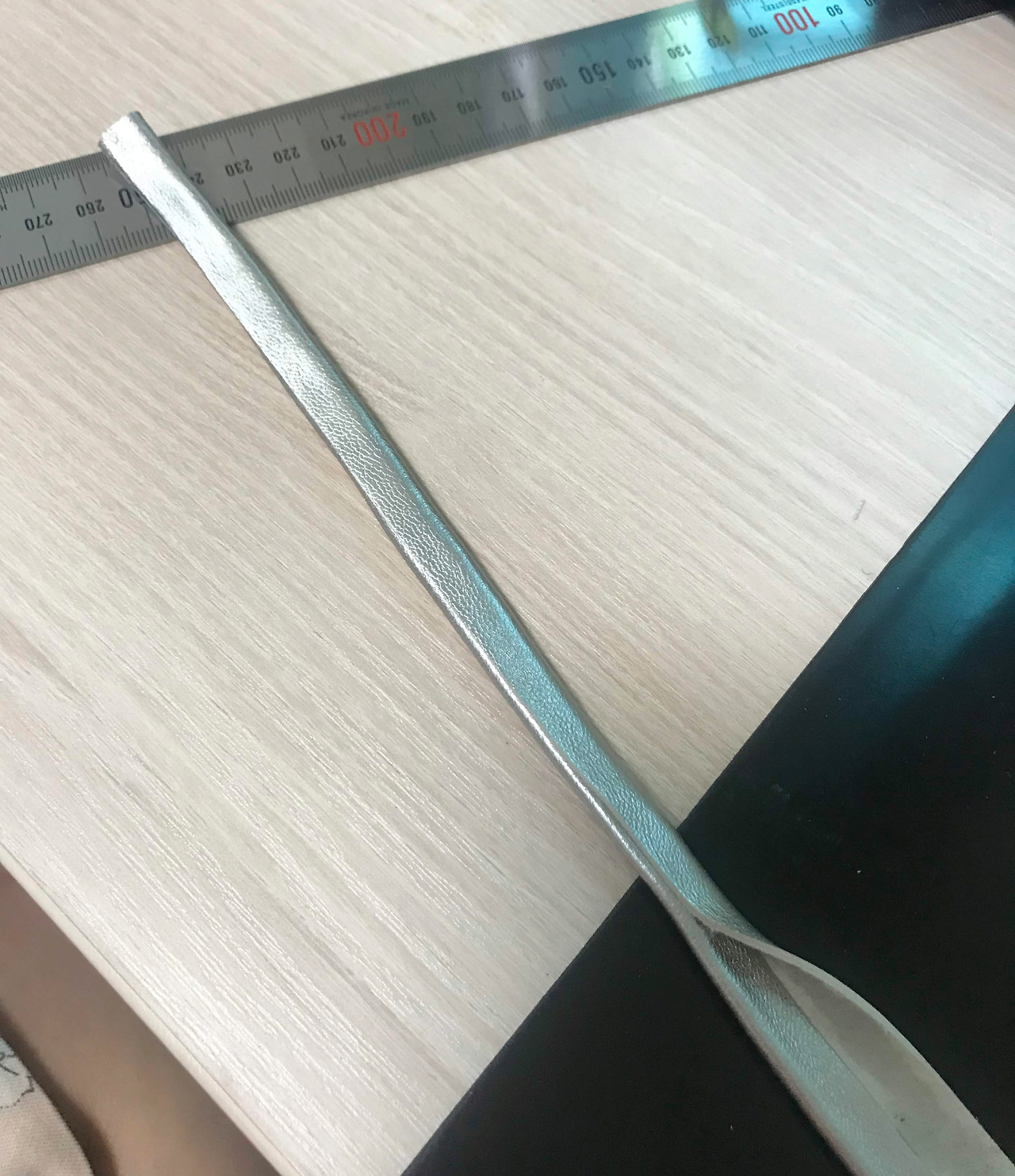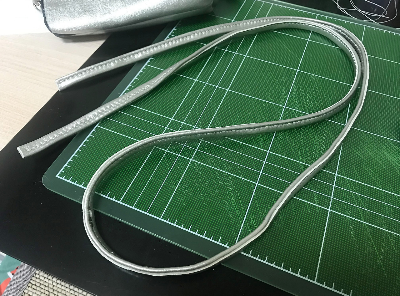 별도의 체인을 사용하거나 하지 않는 이상 가방끈 역시 수제로 만들어야 한다. 가방끈의 길이를 결정하고 3cm 정도의 너비로 길게 재단한 뒤 본드를 붙여가며 1cm 두께의 끈 모양을 잡아간다.