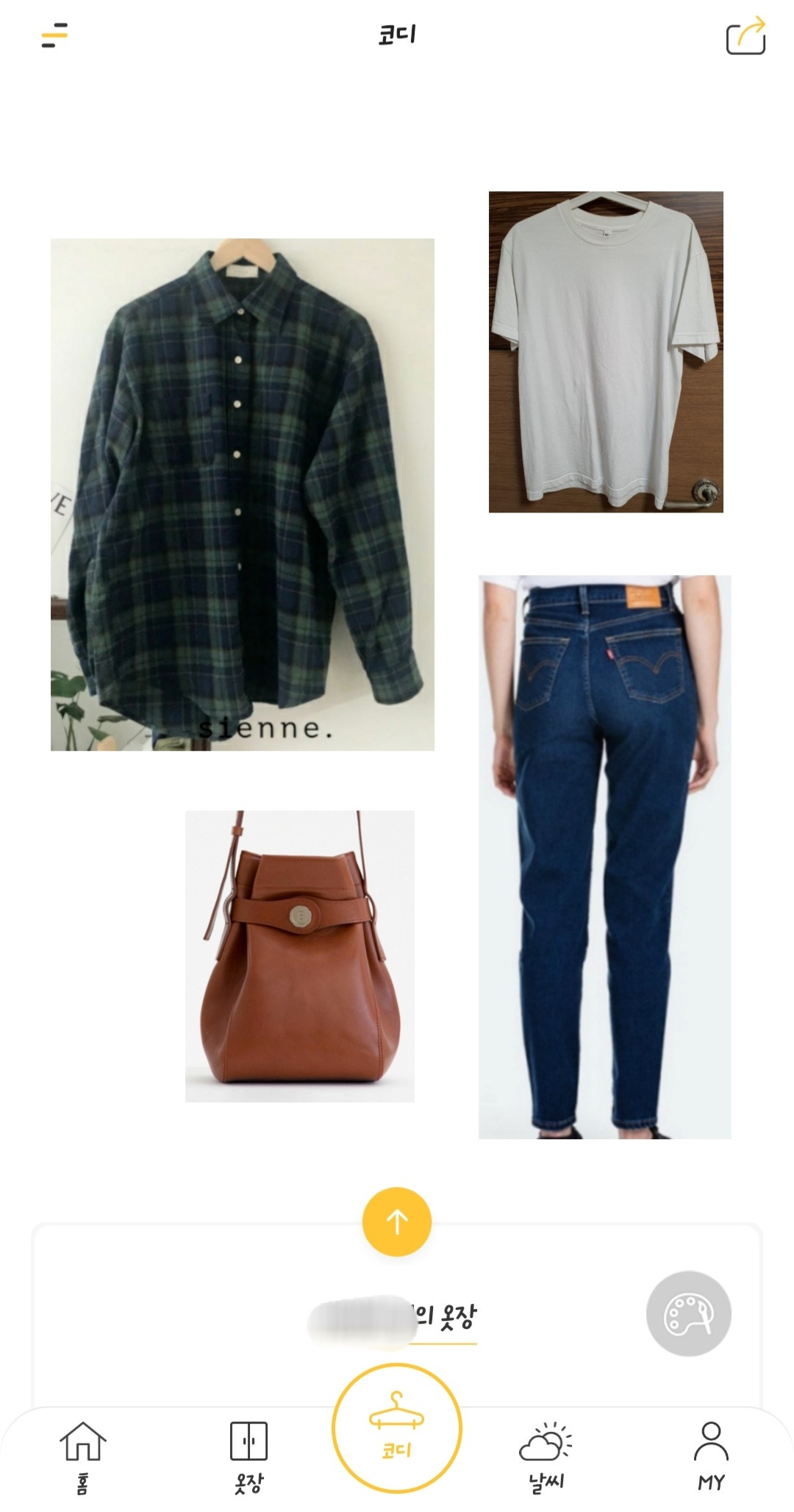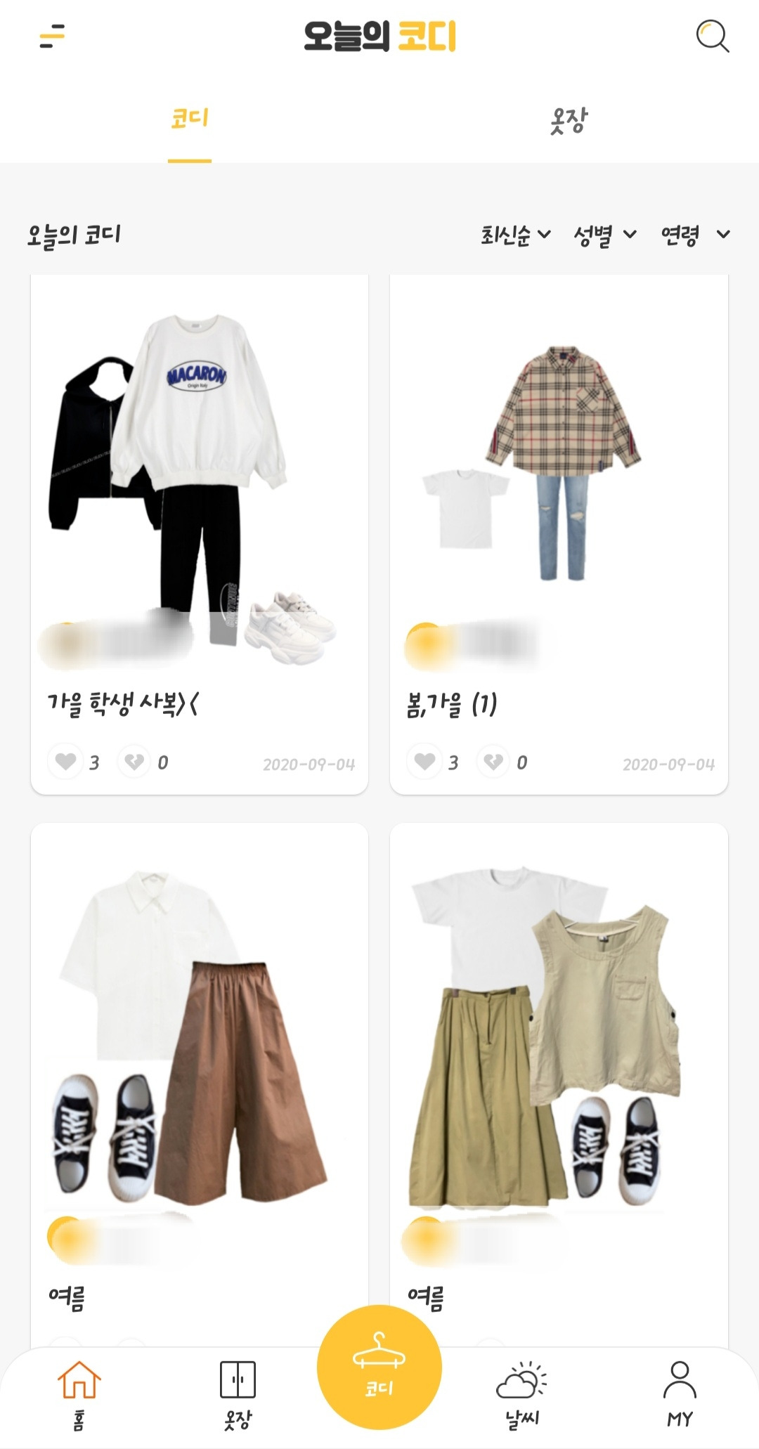 앱의 첫 화면인 '홈'에는 다른 사용자들이 올린 코디 콘텐츠가 실시간으로 올라온다. 이 앱의 목적이 '내가 가진 옷을 통해 코디를 쉽게 하고 남들과 공유하는 것'인데, 나는 옷장 기능만을 사용하기 위해 앱을 다운로드했고 코디한 결과물을 공유하지는 않는다. ('옷장'을 첫 화면으로 바꿀 수 있는 설정 기능도 있었으면 한다!)