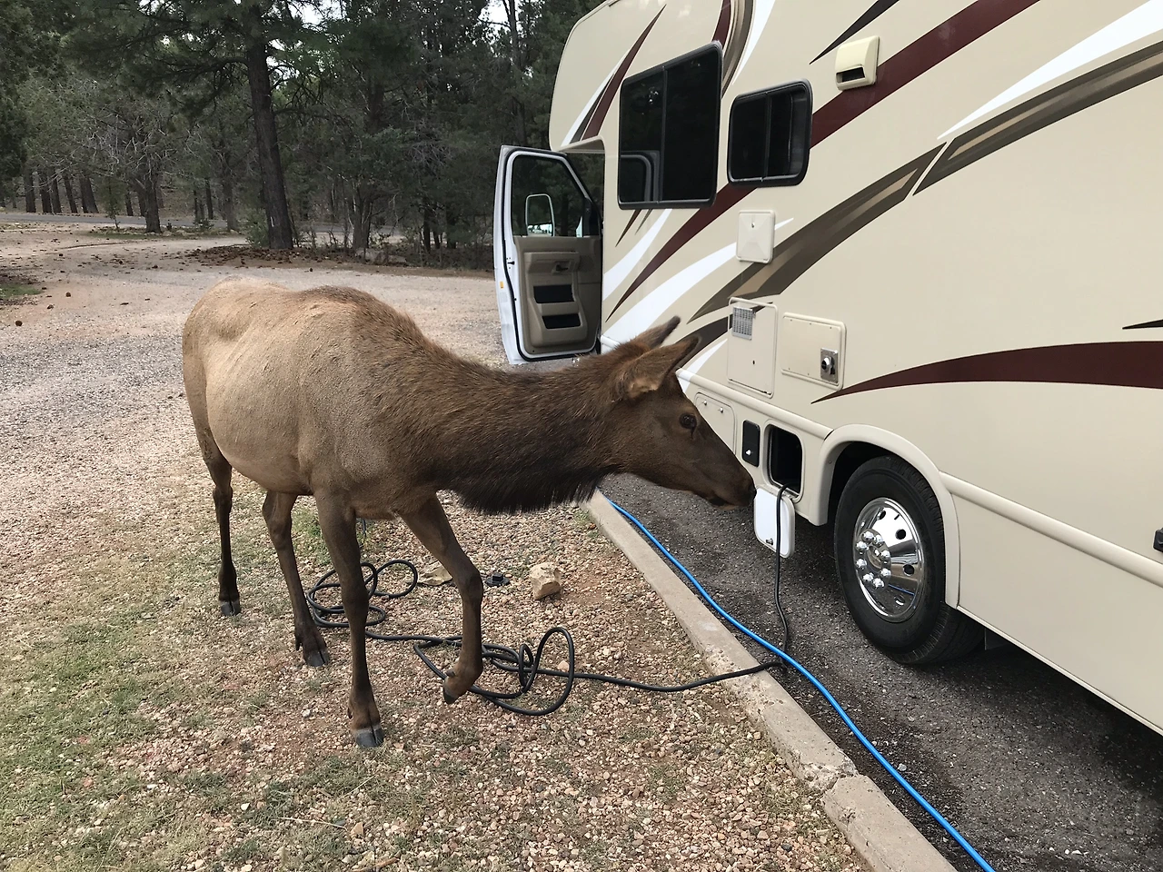 차를 조심스레 움직여 도로에 진입하자, 역시나 가족들의 반응은 폭발적이다. 바닥에 고정되어 있던 캐러반이 아니라 도로를 달리는 진짜 캠핑카라는 사실만으로도 몇 배는 더 즐거운 표정이다. 한편, 행복해하는 가족들과 달리 운전석에 앉은 나는 핸들을 잡은 팔에 경련이 일어날 정도로 긴장하고 있었다. 역시나 캠핑카 운전은 결코 만만하지 않다. 복잡한 라스베이거스 시내를 벗어날 때까지는 주변의 차량들이 신경 쓰여 차선을 변경하기도 조심스러웠고, 그랜드캐년으로 향하는 국도에서는 강풍에 차가 흔들릴 때마다 손에 땀이 배어났다. 그렇게 잔뜩 긴장한 상태로 5시간 넘게 운전을 해서 겨우 겨우 그랜드캐년에 도착했을 때에는 비로소 한 숨 돌리는가 싶었으나, 아직 끝난 게 아니었다. 오토캠핑장에 도착해 배정받은 RV 캠핑 사이트에 주차하면 해야할 일들이 산더미처럼 쌓여 있었다. 먼저 차량의 수평을 맞추고, 밤새 난방을 하기위해 전기선도 연결해야 한다. 상수도를 연결해 물탱크를 채워야 하고, 하수도 튜브로 차량의 오폐수(싱크대 하수와 화장실 정화조)도 비워야 한다. 도로를 달리는 진짜 캠핑카를 탄다는 것은 이 모든 번거로운 과정을 포함하는 그야말로 “일"이었다.