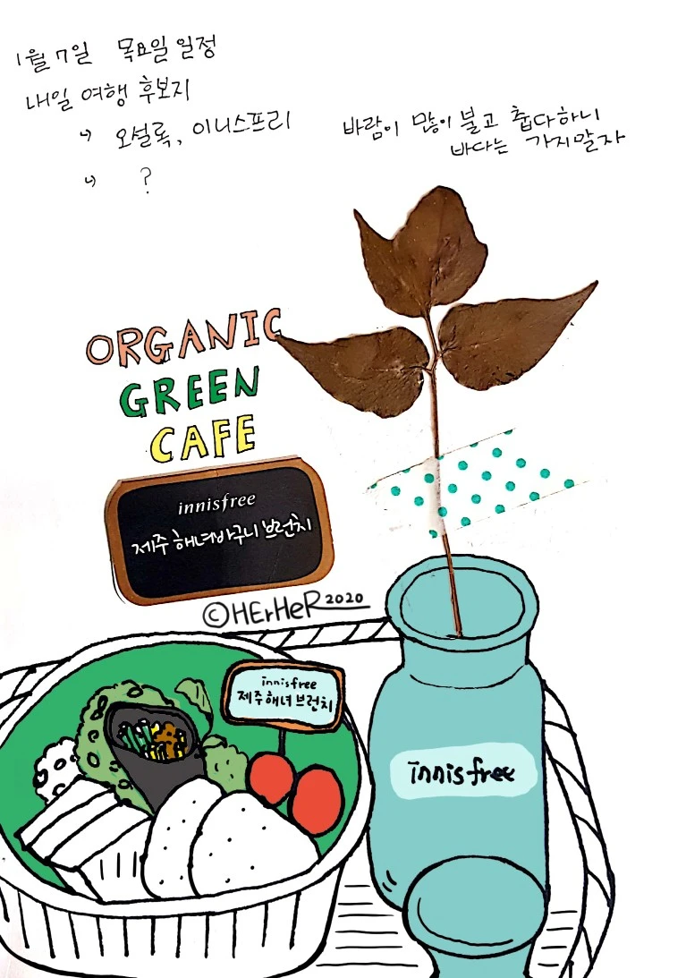 뮤지엄 안에 들어가 생각지도 못한 녹차 시음도 하고 박물관 구경도 했다. 난 녹차 별로 좋아하지도 않는데 내가 여기서 무엇을 하는 걸까?라는 생각을 하며 걷다가 현무암 돌을 붙여놓은 건물로 이동했는데 이 곳에서는 향긋한 냄새가 난다. 익숙한 초록색 이니스프리 로고가 보이고 안으로 들어가니 화장품 진열대 옆으로 널따란 원목 테이블이 보였다. 커다란 통유리 창문으로 햇살이 눈부시게 들어온다. 아, 여기서 커피 마시면서 그림 그려야겠다.