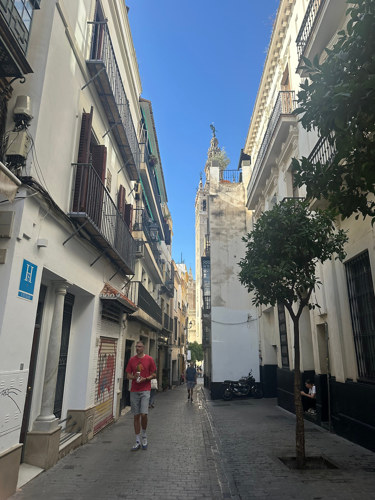 세비야에서 둘째날, 온전히 하루를 즐길 수 있는 하루이다. 아침 일찍 일어나 조식을 먹고 나갈 준비를 했다. 해가 강하게 내리기 전에 세비야의 대표적인 관광지를 둘러볼 생각으로 나섰다. 활기차던 상점들이 닫혀있는 오전의 거리 고요한 거리와는 다르게 내마음은 분주했다. 바로 알카사르 티켓 구매를 하기 위해서 이다. 블로그 같은데에 현장구매를 못할 수 도있다는 이야기와 정보들이 나를 겁나게했다. 그 와중에 세비야의 거리는 너무 이뻣다. 거리의 끝 세비야 대성당 종탑이 빼곰히 내민 모습을 보고 분주한 내마음을 뒤로 한체 카메라를 들었다. 남은 건 사진이다. 대성당 앞에서 엄마랑 나는 사진을 찍은 후 알카사르 티켓부스로 향했다. 다행히 운이 좋게 줄은 짧았고 한시간 뒤 입장할 수 있었다. 이 짧은 시간을 알차게 활용하기 위해 우리는 스페인 광장으로 향했다.