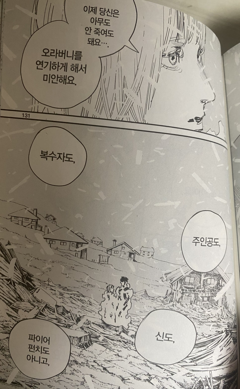 하지만 후반부 작화는 늘 좋다고 할 수 없습니다. 물론 제게 있어서는 그림만 놓고 보는 만화가 아니었으니 상관이 없었습니다만, 객관적으로 봐도 초반부 작화와 후반부 작화에는 차이가 있습니다. 이것은 출판 만화 대부분에서 나타나는 현상이기도 합니다. 하지만 이야기가 종막으로 향하는 동안 워낙 전개를 많이 비틀어대는 탓에 지친 독자의 눈에는 작화 또한 불만 사항으로 들어올 가능성이 충분히 있습니다. 결국 소위 말해 '산으로 가는 스토리'와 어시트턴트가 나가기라도 한 것인지 조금씩 아쉬워지는 작화가 결합되어 후지모토 타츠키 특유의 뒷심 부족으로 이어지는 게 아닌가 싶습니다.