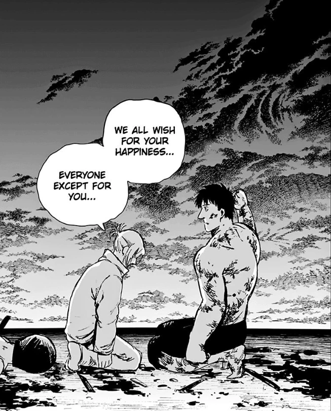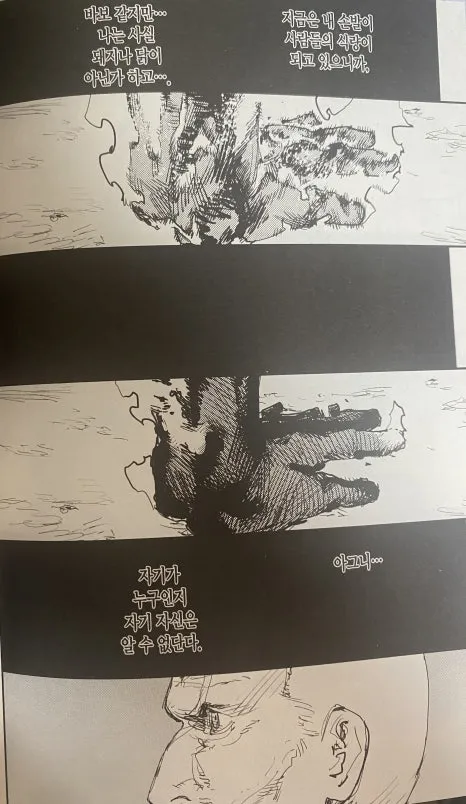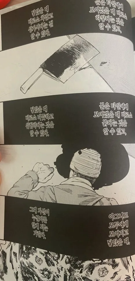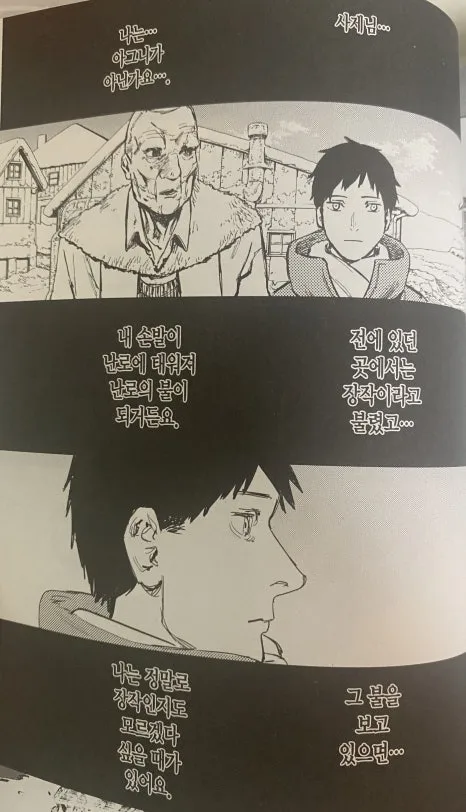 제가 갖고 있는 만화책을 직접 찍은 것이라 사진이 썩 좋진 않지만, 무슨 말을 하는지는 분명히 이해할 수 있으실 겁니다. 사제는 아그니에게 '자신이 누구인지는 타인에게 평가를 받아야 비로소 아는 것이다'라고 말합니다. 그래서 아그니는, 언젠가는 루나에게 더없이 좋은 오라버니였으며 언젠가는 장작이었습니다. 언젠가는 토가타의 영화 속 주인공 파이어맨이었으며 또 언젠가는 아그니교의 신이었습니다. 그리고 무수한 사람을 죽이며 세상을 배반한 살인귀 파이어 펀치이기도 했습니다. 살아가는 것에 있어 타인과의 상호작용이 불가피한 이상, 그 삶 속에서 '나'를 무엇인지 규정하는 것은 결국 타인의 평가라는 이야기입니다. 그것이 자신이 원해서 한 일이든, 원하지 않음에도 떠밀려 한 일이든, 아니면 어쩔 수 없이 연기를 한 일이든 말입니다.