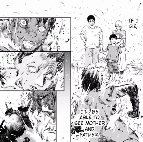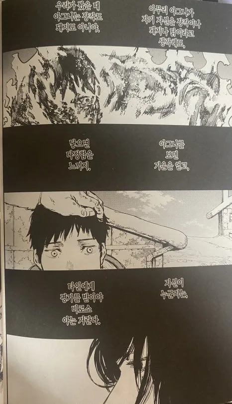 특히 회상 장면에서 그런 점이 잘 드러납니다. 주인공이 과거의 한 순간을 회상하는 것이 수 번에 걸쳐 나옵니다. 하지만 다른 만화와는 사뭇 다른 느낌으로, 회상을 할 때마다 마치 다른 카메라로 촬영한 것처럼 이전과 다른 시퀀스를 보입니다. 구도와 대사가 바뀌는 것과 함께 주인공의 독백 또한 바뀝니다. 이런 연출은 출판 만화보다는 영화에 어울리는 연출이라고 생각합니다. 후지모토 타츠키는 본인만의 색다른 방법론에 입각하여 데뷔작 파이어 펀치의 세계를 훌륭하게 묘사했습니다.