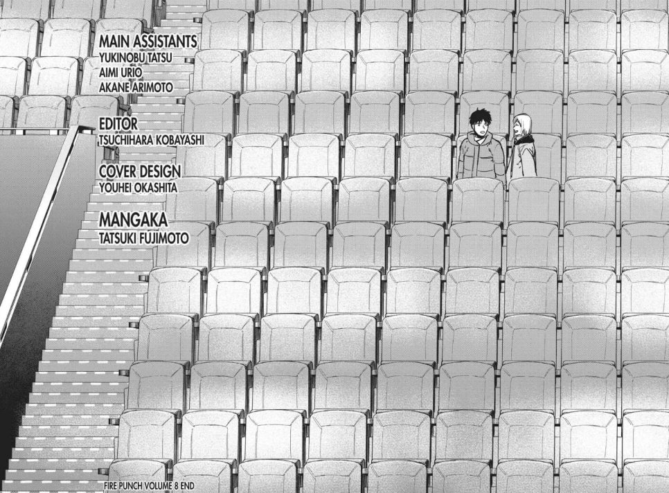 이 작화 구성에는 지금 들으면 입이 떡 벌어지는 어시스턴트들이 함께했습니다. 현재는 모두 데뷔하여 본인의 이름을 내건 히트 작품을 멋지게 연재하고 있습니다. '지옥락'의 카쿠 유지, '스파이 패밀리'의 엔도 타츠야, 마지막으로 최근 넷플릭스에서 인기를 끄는 '단다단'의 타츠 유키노부입니다. 이 훌륭한 재능의 작가들과 후지모토 타츠키가 공들여 그려낸 것이 파이어 펀치의 세계입니다. 그 덕에 배경을 비롯해서 눈보라가 휘날리는 효과, 태양빛, 해수면과 물방울 등 자잘한 부분까지 훌륭한 작화를 보일 수 있었습니다. 특히 후지모토 타츠키 본인이 그렇게나 좋아하는 영화적 연출(카메라 워크 및 다양한 구도)을 위해서는 그림에 적잖은 수고가 들어갈 텐데, 이 어시스턴트들의 노고가 상당히 컸다는 것을 짐작할 수 있습니다. 카쿠 유지와 엔도 타츠야는 파이어 펀치를 함께한 뒤 본인들의 개인 작품을 연재하기 시작했으며, 타츠 유키노부는 체인소 맨 1부 연재까지 동행했습니다. 단순히 네임밸류만 놓고 보더라도 상당한 무게감을 갖는 파이어 펀치입니다.
