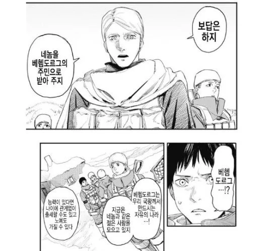 세상이 얼어붙으며 먹을 것도 당연히 줄어들었습니다. 작물을 재배하는 것도, 짐승을 사냥하는 것도 점점 어려워집니다. 자신들을 거둬 준 노인들의 마을을 아사로부터 지키기 위해, 아그니는 무서운 결단을 내리고 있었습니다. 바로 자신의 팔을 잘라서 고기를 제공하는 것입니다. 아무리 잘라도 다시 재생될 만큼 강한 회복 능력을 지니고 있으니, 고통만 감수한다면 모두를 먹일 수 있는 식량이 나오는 셈입니다. 물론 노인들 중에는 인육을 먹는 것을 거부해 죽음을 맞이하는 사람들도 있었습니다. 하지만 주인공 남매를 거둬 준 사제는 그 모든 고통을 받아들이더라도 죽음만은 저항해야 한다고 말합니다. 그 믿음을 따르는 사람들은 아그니의 고기를 먹으며 연명하고 있었습니다.