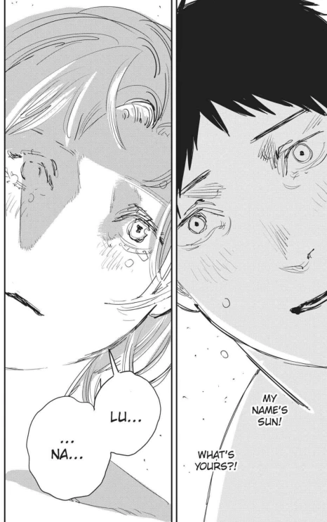 나무가 된 유다가 별을 데워 주는 것도 결국 한계가 있었습니다. 많은 시간이 흘러 행성은 조각이 났고 그러는 와중에도 아그니는 여전히 살아 있었습니다. 그렇게 우주로 흘러 나온 아그니는 나무 속의 유다(자신을 루나라고 지칭하지만)와 만나게 되고, 둘은 서로를 '선'과 '루나'로 소개하며 애틋한 해후 속에서 눈을 감습니다. 그것과 동시에 유다 또한 길었던 삶에 마침표를 찍게 됩니다. 이 기묘한 결말로 인해 파이어 펀치는 많은 비판을 받았습니다. 이후에 나오는 장면이라고는 영화관을 떠나는 소년 소녀 시절의 아그니와 루나의 장면이 전부입니다.