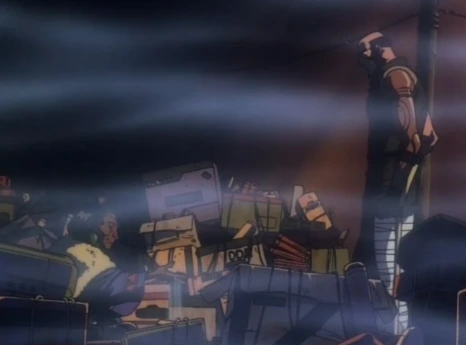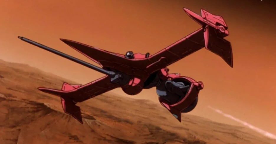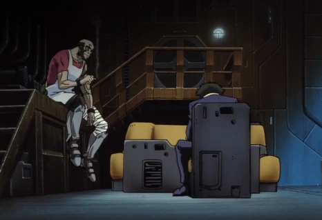스파이크와 비셔스가 최후의 결투를 하는 장면에서 서로의 무기를 발로 밀어 교환하는 장면은 <영웅본색 2>의 오마주입니다. 모든 결판을 낸 주인공이 생사를 떠나 어딘가 초연하고 편안해 보인다는 점, 뒤늦게 달려온 사람들의 시선을 받으며 작품이 끝난다는 점은 영웅본색 2의 엔딩과 유사합니다. 다만 비밥이 단순한 홍콩 영화 오마주 애니메이션이 되지 않은 이유는 역시 SF, 스페이스 오페라라는 세계관 덕분이라고 생각합니다. 와타나베 신이치로는 완구 판매를 위해 로봇 애니메이션을 전문적으로 제작하던 선라이즈에 입사하여 여러 작품에 참여했습니다. <기갑엽병 메로우링크>, <기동전사 건담 0083>, 그리고 본격적으로 그가 감독 역할로 참여한 <마크로스 플러스> 등이 대표적입니다. 이런 로봇 애니메이션들은 기술이 엄청나게 발달한 미래에서 우주를 배경으로 펼쳐지고 있었습니다. 이를 통해 카우보이 비밥의 세계관이 와타나베 신이치로라는 사람 안의 어떤 부분으로 구성되었는지 추측해볼 수 있습니다. 자신이 좋아하는 것과 잘 해온 것을 절묘하게 배합하여 훌륭한 작품을 만들어냈다고 할 수 있겠습니다. 특히 비밥 안에서 많은 비중을 차지하는 것은 아니지만 나올 때마다 수준급인 전투기 액션은 그가 감독했던 마크로스와의 연관성이 잘 나타납니다.