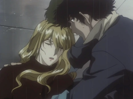 결국 그는 자신이 지금 살아 있는 현실을 현실이라 생각하지 못하고 '나쁜 꿈을 꾸고 있는 것'이라 여기게 됩니다. 죽는 것이 하나도 두렵지 않았던 마피아 생활 속에서 줄리아를 만나 삶의 의지, 즉 살고 싶다라는 생각을 갖게 되어 조직을 벗어날 계획까지 세웠으나 줄리아를 잃음으로서 삶의 의지 또한 다시 잃어버린 것입니다. 때문에 스파이크는 죽음에 대한 공포가 없습니다. 흉악범들 앞에서도 전혀 겁먹지 않으며 위험한 일에 몸을 던지는 것을 망설이지 않습니다. 오히려 사선을 넘나드는 스릴 속에서야 간신히 의욕을 냅니다. 그 외의 상황에서는 마치 꿈 속을 사는 것처럼 현실감 없는 나날을 보내고, 일이 잘 풀리지 않을 때마다 '이건 나쁜 꿈일 뿐이다'라며 자기 최면을 겁니다. 괴로운 과거로부터 도망치고 있는 것입니다. 작게 보면 스파이크가 잃어버린 건 사랑하는 사람이지만, 크게 본다면 스파이크가 상실한 것은 자신이 지금 살아 있는 현실이라고 할 수 있습니다.