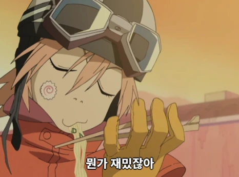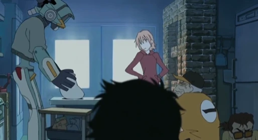 칸치의 ma-1 자켓 또한 눈에 띕니다. ma-1은 미국의 군용 자켓으로, 일상에도 널리 보급되어 가장 많은 매니아층을 갖고 있는 군수품 중 하나입니다. 특히 일본의 경우 미국이 전쟁 당시 제조하던 ma-1을 그대로 복각하는 의류 업체가 여럿 있습니다. 더해서 우라하라를 필두로 한 일본 스트리트 패션에서 끊임없이 활용되는 것이 ma-1입니다. 굳이 로봇에게 이 자켓을 입힌 이유 역시 제작진의 취향과 매니아적 성향이 잘 드러나는 부분입니다. 외에도 프리크리를 보다 보면 레트로한 분위기가 잘 묻어나는 패션이 여럿 있습니다. 이런 부분을 즐기는 것또한 작품을 감상하는 방식 중 하나가 될 수 있겠습니다.