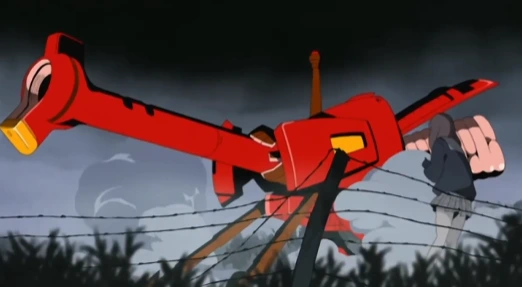 나오타를 적대 로봇으로부터 구해 주는 칸치는 언제나 당당하게 맞서 싸웁니다. 그 마무리는 늘 위 사진과 같이 캐논 형태로 변하여 커다란 한 방을 먹이는 것입니다. 단 한 발만 쏠 수 있지만, 그 한 발로 모든 것이 끝납니다. 이 어마어마한 위력의 포탄은 난다바 나오타입니다. 칸치는 나오타를 탄환으로 써서 적대 로봇을 쓰러뜨립니다. 여기까지 왔다면 이 은유에 대한 해석도 간단합니다. 소년, 나아가 청춘이 지닌 힘과 가능성에 대한 묘사입니다. 그리고 탄환이 나오타 본인인 것은 그 힘의 주체가 결국 우리 자신이라는 것을 의미합니다. 이상이라는 총에 자기 자신을 장전해 그 무엇이든 꿰뚫을 수 있는 힘을 가진 청춘을, 프리크리는 칸치와 나오타를 통해 보여주고 있습니다.