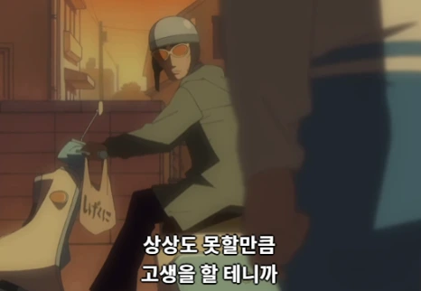 감독이 베스파의 매니아이기에 하루코는 베스파를 타고 질주합니다. 비슷한 맥락으로 아마라오 관리관도 스쿠터를 타는데, 그는 정장 위에 파카를 입고 선글라스를 쓰고 있습니다. 이 모습은 영국의 모드족(mods)과 닮았습니다. 모드족은 주로 노동자 계층이지만 테일러링 양복을 입고 상류 문화를 향유했습니다. 스쿠터를 타고 달릴 때 비싼 양복을 보호하기 위해 군용 파카를 껴입는 것은 그들의 유명한 특징입니다. 다방면으로 빈곤하고 팍팍했던 노동자들이 과시를 추구하던 모드족처럼, 아마라오 관리관도 자신의 부족한 내면을 감추려 김으로 된 눈썹을 덧붙입니다.
