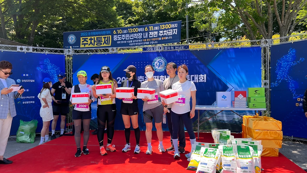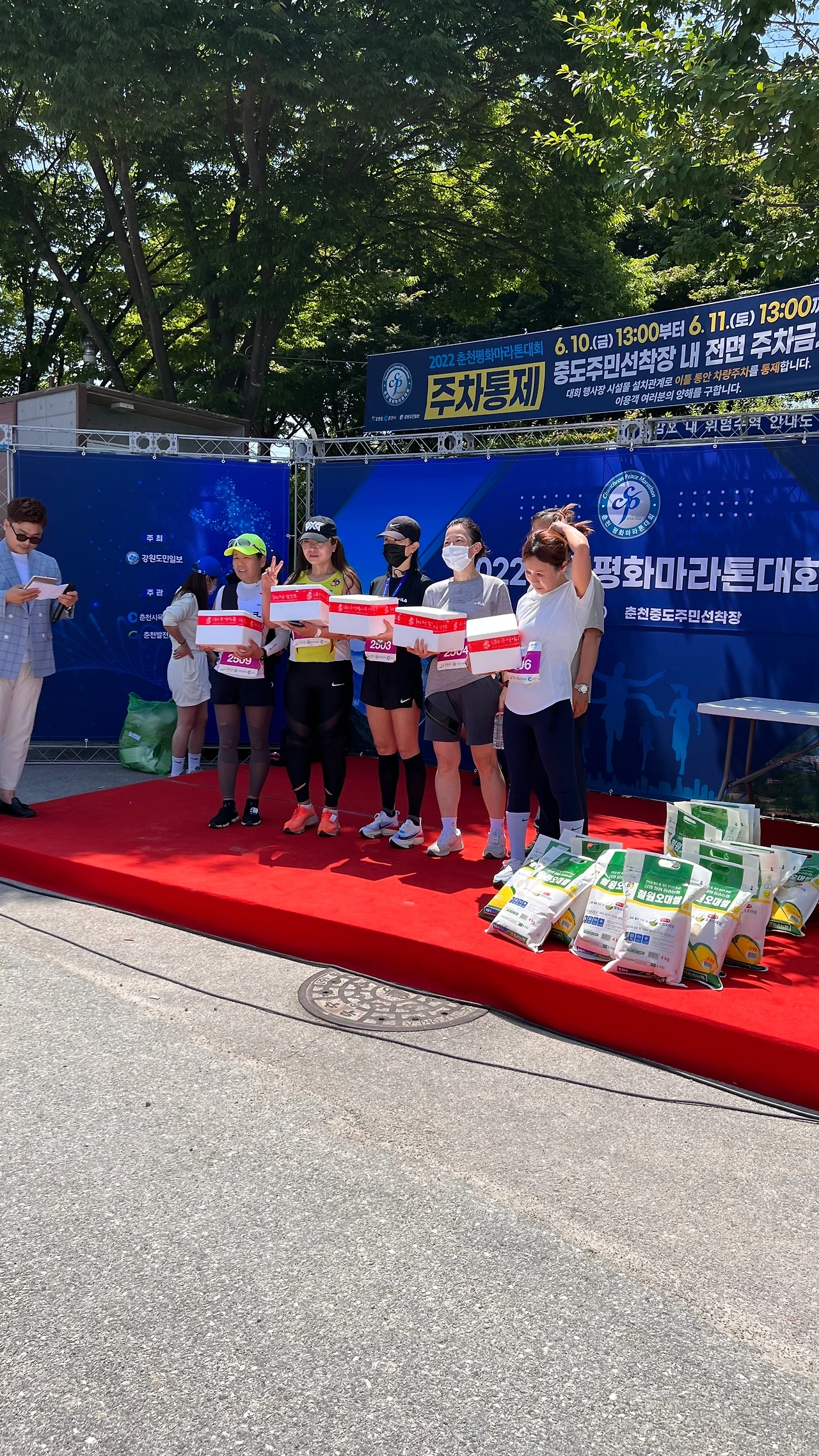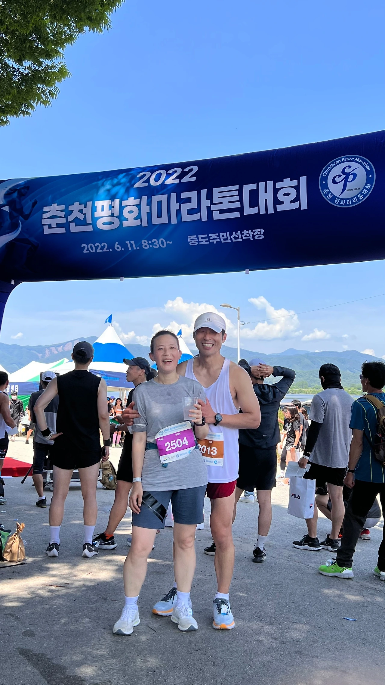 오랫만의 오프라인 레이스라 하프코스에는 프로급 러너들이 많이 참가했고 10키로에 참가한 젊은 러너들이 내 앞으로 씽씽 지나갈때 마다 내 무거운 몸이 한탄스럽기도 했다. 하프코스에 참가한 여자 러너들은 총 13명 그 중 나를 포함 3명 정도를 제외하고 모든 선수들이 준 프로급에 가까운 러너들이었다. 모든 선수들이 내 앞으로 힘차게 지나가고 나외 한 두명의 주자들만이 외롭고 조용하게 레이스를 진행했다. 내 뒤에 오던 여성 한 분의 숨 소리가 어느 지점부터는 들리지 않았고 그렇게 나는 호수를 혼자 독차지 하고 땡볕과의 싸움을 시작했다. 포기하고 멈춰 서고싶은 마음이 수십 번도 더 들었지만 3시간이라는 시간 제한에만 걸리지 않고 끝까지 걷지 말고 달리자고 마음을 먹었다. 중간 중간 급수대에서 자원봉사자들의 응원을 독차지한 나는 그들의 응원에 힘을 입어 멈추지 않고 계속 달릴 수 있었다. 그리고 드디어 피니시 라인을 통과하는 순간 함께 5키로에 참여했던 남편의 친구 가족이 건내주는 이온 음료는 내겐 생명수와도 같은 느낌을 주었다. 그렇게 마친 레이스의 기록은 2시간 16분. 내 개인적으로는 나쁜 기록은 아니었다. 잘 달리는 러너들이 대부분이었기에 거의 꼴지로 들어왔지만 끝까지 달려낸 나 자신에게 아낌없는 칭찬을 보낸다. 13명의 여성 하프러너 중 10번째로 들어왔다. 닭갈비의 고장에서의 마라톤이었기에 닭갈비를 10등 상으로 받았다. 3년 전 2시간 50분 만에 하프를 뛰었던 것에 비하면 엄청난 발전을 한 것이다. 이번 경기에서도 거의 꼴찌로 들어왔지만 악조건 속에서도 나의 한계를 넘어섰기에 나는 한 걸음 또 나아간 하루였다. 다음 도전에서는 또 한 걸음 나아갈 수 있을것이라는 믿음과 기쁨으로 마무리한 이번 춘천 평화 마라톤 대회도 오래도록 내 기억에 남을 것 같다.