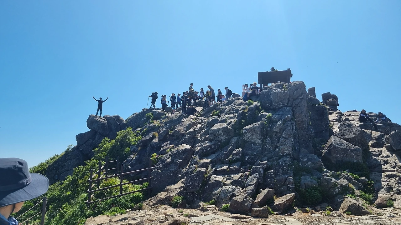 정상석에서 사진을 찍기 위한 줄이 제법 길었다. 우리는 줄을 서지 않고 절벽 아래로 내려가 비스듬히 정상석이 나오도록 사진을 찍고
