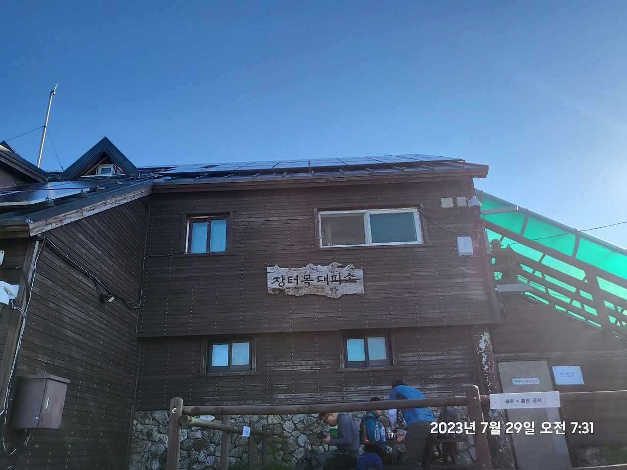사람들이 많은 탓에 겨우 자리를 잡고 아침식사를 했다. 긴 산행으로 먹을거리가 아쉬웠던 우리와 달리장터목에서 묵은 사람들은 풍성한 먹을거리를 자랑하고 있었다. 옆자리 사람들이 끓이는 누룽지 냄새가