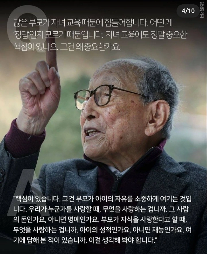 102세 김형석 연세대 철학과 명예 교수님은 자녀 교육의 핵심은 부모가 자녀의 자유를 소중히 여겨주는 것이라고 말씀하신다. 격하게 공감한다. 오늘날 한국 사회에서는 아이들의 자유가 존중되기 힘들다. 그럼 대한민국의 부모들은 아이들을 사랑하지 않는걸까? 그렇지 않다. 부모의 사랑이 사회적인 관념과 강박 속에서 잘못 표현되고 있기 때문이다. 입시 위주의 치열한 경쟁 속에서 자녀가 살아남아 좀 더 나은 삶을 살 수 있길 바라는 부모의 사랑이 불안감 속에서 잘못 표현되고 있기 때문이다.