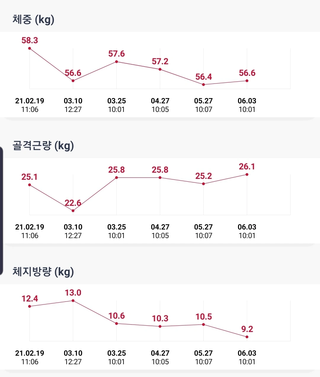 처음 21프로의 체지방률로 시작해 바디프로필 찍기 직전엔 체지방률을 16프로까지 낮출 수 있었다.